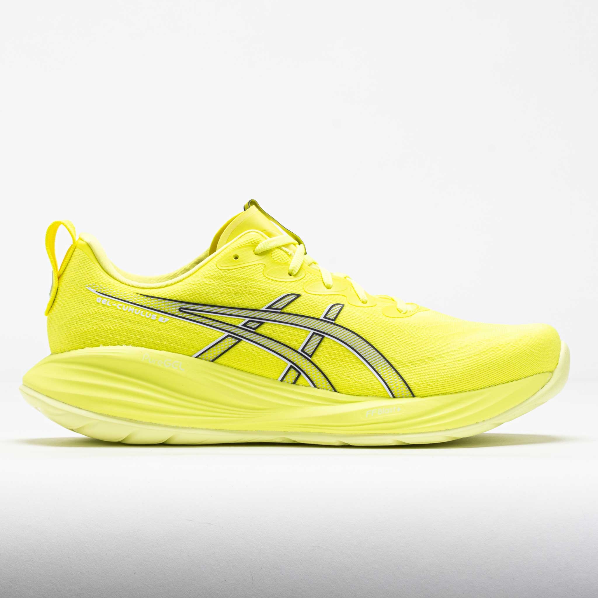 Light, bouncy and energetic, the ASICS GEL-Cumulus 27 is a daily training titan! This neutral running shoe is a versatile option for various workouts. Stay smooth under the full-length FF BLAST™ PLUS midsole while PureGEL™ technology adds soft landings. The FLUIDRIDE™ outsole features a rubberized EVA blend for smooth transitions. If you need a reliable shoe for daily training, choose the ASICS GEL-Cumulus 27! What's New? - Spacious toe box offers a more accommodating fit. - Premium padded tongue and knit pull tab improve step-in comfort. Who's it for? - Neutral runners who want a soft, flexible ride during daily training miles. - Runners seeking a reliable training partner to support them through long distances. - Beginners looking for a comfortable, entry-level shoe to start their running journey. Shoe Technology Upper: Engineered mesh upper provides breathability to keep you comfortable. Reflective details improve visibility in low-light conditions. Knit heel pull tab offers easy entry and removal. OrthoLite™ X-30 sockliner provides step-in comfort. The sockliner features a solution dyeing process that reduces water usage and carbon emissions. Made with at least 75% recycled materials for eco-friendly comfort. Midsole: Full-length FF BLAST™ PLUS foam absorbs impact for responsive rebounds and cloud-like cushioning. PureGEL™ technology offers soft landings. Outsole: FLUIDRIDE™ outsole encourages smoother transitions for a natural ride. PRODUCT SPECIFICATIONS - Support: neutral - Color: Citron/White - Forefoot Height: 29.5mm - Heel Height: 37.5mm - Offset: 8mm - Weight: 8.2 Ounces (Size 8.5) - Item #: 043220 - Style #: 1011B960.750 US sales only.