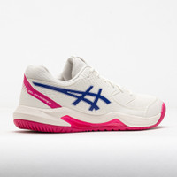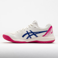 Stay secure while changing directions in the ASICS GEL-Dedicate 8. This tennis shoe features a durable upper with synthetic leather overlays for protection. TRUSSTIC® technology and a wrap-up outsole improve stability to help you move freely on the court. When you need your mind to stay centered on the match, let the ASICS GEL-Dedicate 8 keep you grounded! What's New? - Synthetic leather and mesh upper enhances ventilation while improving lateral support. - Updated TRUSSTIC® support system and wrap-up outsole improve lateral control. - Redesigned collar and heel offer a comfortable step-in feel. Who's it for? - Baseline tennis players looking for a stable tennis shoe to support their style. Shoe Technology Upper: Durable upper with synthetic leather toe overlays for protection and support. Solution dye sockliner helps reduce water usage by approximately 33% and carbon emissions by 45%. Midsole: GEL® cushioning absorbs shock to keep you comfortable. TRUSSTIC® technology improves lateral stability for confident moves. Outsole: Wrap-up outsole supports smooth landings. PRODUCT SPECIFICATIONS - Color: Cream/Cobalt - Forefoot Height: 22mm - Heel Height: 30mm - Offset: 8mm - Weight: 7.8 Ounces - Item #: 118473 - Style #: 1042A237.105 US sales only. Item is returnable, but does not qualify for free returns.