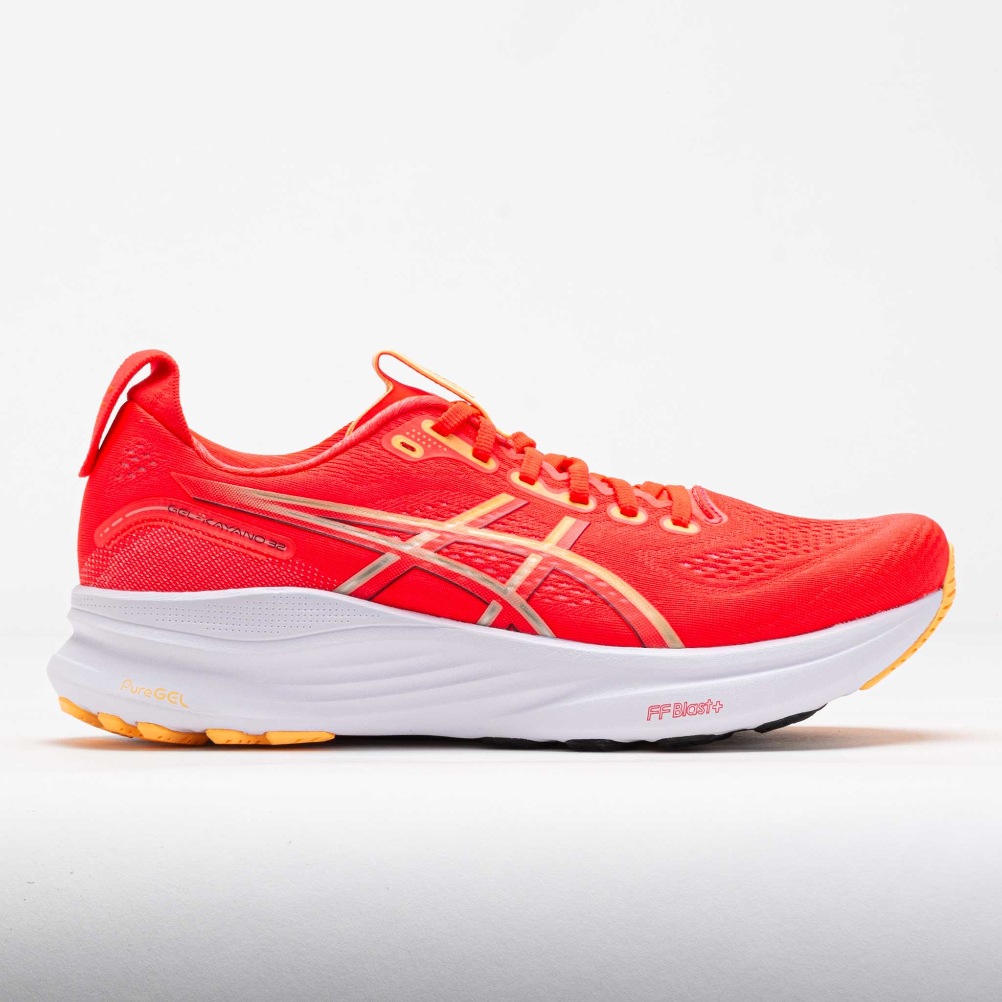 Premium comfort and reliable support combine in the ASICS GEL-Kayano 32! This iconic running shoe sets the bar for stability, delivering on-demand support with every stride. The 4D Guidance System™ leads your foot through a more balanced gait cycle. This technology adapts to your form when it fades, providing reliable support when needed. Enjoy soft landings on the PureGEL™ and FF BLAST™ PLUS midsole. At the pinnacle of comfort and support, you'll find the ASICS GEL-Kayano 32! What's New? - Extra 2mm of FF BLAST™ PLUS cushioning in the forefoot delivers long-distance comfort. - Engineered mesh upper offers an improved fit, extra stretch and enhanced breathability. Who's it for? - Overpronators who need a comfortable and supportive shoe for daily training runs. - Runners who want reliable comfort and long-lasting protection during long distances. Shoe Technology Upper: Lightweight mesh upper provides comfort and breathability. Knit heel pull tab offers easy entry and removal. Reflective details enhance visibility in low-light conditions. Reinforced tongue wing along the arch provides comfort and support. Midsole: FF BLAST™ PLUS provides cloud-like cushioning and lightweight responsiveness. Rearfoot PureGEL™ technology adds softness to every stride. 4D Guidance System™ intuitively responds under excessive load, providing comfort and stability. OrthoLite™ X-55 sockliner provides step-in comfort and moisture management. The sockliner features a dyeing process that reduces water usage by approximately 33% and carbon emissions by 45%. Outsole: HYDBRID ASICSGRIP™ outsole provides durable traction on various surfaces. PRODUCT SPECIFICATIONS - Support: support - Color: Flash Red/Beet Juice - Forefoot Height: 32mm - Heel Height: 40mm - Offset: 8mm - Weight: 10.5 Ounces - Item #: 043151 - Style #: 1011C052.600 US sales only.