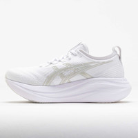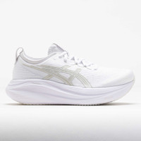Find your calm in the ASICS GEL-Nimbus 27! This neutral running shoe combines plush and eco-friendly materials for a smooth ride. Stay comfortable while you cruise through daily miles in the jacquard mesh upper. Enjoy smooth landings on the PureGEL™ midsole, while bio-based FF BLAST™ PLUS ECO foam adds softness. Smooth, light and eco-friendly, the ASICS GEL-Nimbus 27 keeps your feet in the clouds! What's New? - Extra 2mm of FF BLAST PLUS ECO™ provides softer landings and responsive rebounds. - Engineered jacquard mesh upper wraps the foot with a soft feel to improve breathability. Who's it for? - Neutral runners who want a comfortable shoe for high weekly mileage, long distances and recovery runs. - Active walkers who need a highly-cushioned shoe to add comfort to their daily strolls. Shoe Technology Upper: Engineered jacquard mesh upper wraps the foot for a soft and secure feel. Knit collar and tongue provide premium comfort. Made with at least 75% recycled materials to reduce waste and carbon emissions. OrthoLite™ X-55 sockliner improves step-in comfort. The sockliner features a solution dyeing process that reduces water usage compared to conventional methods. Reflective details improve visibility in low-light situations. Midsole: FF BLAST™ PLUS ECO cushioning made with approximately 24% bio-based content for shock absorption and responsive lift-offs. PureGEL™ technology provides lightweight cushioning to keep you comfortable. Outsole: HYBRID ASICSGRIP™ outsole delivers soft and superior traction in any condition. PRODUCT SPECIFICATIONS - Support: neutral - Color: White/Glacier Grey - Forefoot Height: 35.5mm - Heel Height: 43.5mm - Offset: 8mm - Weight: 10.9 Ounces - Item #: 042287 - Style #: 1011B958.100 US sales only.
