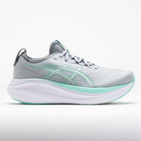 Find your calm in the ASICS GEL-Nimbus 27! This neutral running shoe combines plush and eco-friendly materials for a smooth ride. Stay comfortable while you cruise through daily miles in the jacquard mesh upper. Enjoy smooth landings on the PureGEL™ midsole, while bio-based FF BLAST™ PLUS ECO foam adds softness. Smooth, light and eco-friendly, the ASICS GEL-Nimbus 27 keeps your feet in the clouds! What's New? - Extra 2mm of FF BLAST PLUS ECO™ provides softer landings and responsive rebounds. - Engineered jacquard mesh upper wraps the foot with a soft feel to improve breathability. Who's it for? - Neutral runners who want a comfortable shoe for high weekly mileage, long distances and recovery runs. - Active walkers who need a highly-cushioned shoe to add comfort to their daily strolls. Shoe Technology Upper: Engineered jacquard mesh upper wraps the foot for a soft and secure feel. Knit collar and tongue provide premium comfort. Made with at least 75% recycled materials to reduce waste and carbon emissions. OrthoLite™ X-55 sockliner provides a plush step-in sensation. The sockliner features a solution dyeing process that reduces water usage compared to conventional methods. Reflective details improve visibility in low-light conditions. Midsole: FF BLAST™ PLUS ECO cushioning made with approximately 24% bio-based content for shock absorption and responsive lift-offs. PureGEL™ technology provides lightweight cushioning to keep you comfortable. Outsole: HYBRID ASICSGRIP™ outsole delivers soft and superior traction in any condition. PRODUCT SPECIFICATIONS - Support: neutral - Color: Piedmont Grey/Illuminate Mint - Forefoot Height: 34.5mm - Heel Height: 42.5mm - Offset: 8mm - Weight: 9.5 Ounces - Item #: 042270 - Style #: 1012B753.020 US sales only.