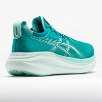 Find your calm in the ASICS GEL-Nimbus 27! This neutral running shoe combines plush and eco-friendly materials for a smooth ride. Stay comfortable while you cruise through daily miles in the jacquard mesh upper. Enjoy smooth landings on the PureGEL™ midsole, while bio-based FF BLAST™ PLUS ECO foam adds softness. Smooth, light and eco-friendly, the ASICS GEL-Nimbus 27 keeps your feet in the clouds! What's New? - Extra 2mm of FF BLAST PLUS ECO™ provides softer landings and responsive rebounds. - Engineered jacquard mesh upper wraps the foot with a soft feel to improve breathability. Who's it for? - Neutral runners who want a comfortable shoe for high weekly mileage, long distances and recovery runs. - Active walkers who need a highly-cushioned shoe to add comfort to their daily strolls. Shoe Technology Upper: Engineered jacquard mesh upper wraps the foot for a soft and breathable feel. Knit collar and tongue provide premium comfort. Made with at least 75% recycled materials to reduce waste and carbon emissions. OrthoLite™ X-55 sockliner provides a plush step-in sensation. The sockliner features a solution dyeing process that reduces water usage compared to conventional methods. Reflective details improve visibility in low-light situations. Midsole: FF BLAST™ PLUS ECO cushioning made with approximately 24% bio-based content for shock absorption and responsive lift-offs. PureGEL™ technology provides lightweight cushioning to keep you comfortable. Outsole: HYBRID ASICSGRIP™ outsole delivers soft and superior traction in any condition. PRODUCT SPECIFICATIONS - Support: neutral - Color: Wave Teal/Illuminate Mint - Forefoot Height: 34.5mm - Heel Height: 42.5mm - Offset: 8mm - Weight: 9.7 Ounces - Item #: 042269 - Style #: 1012B753.400 US sales only.