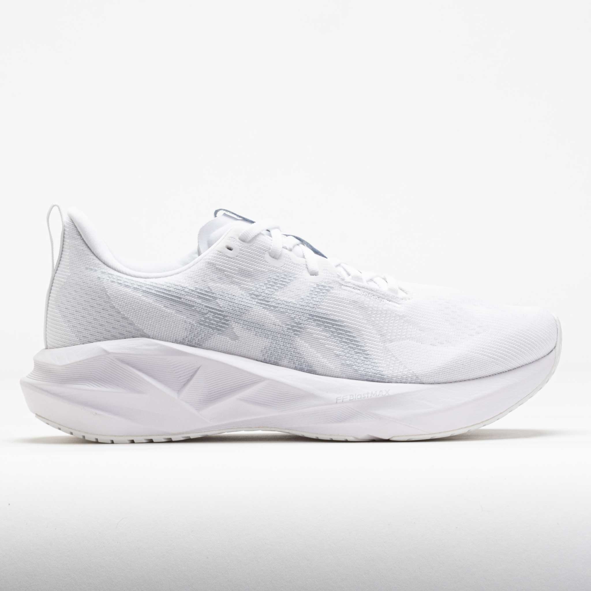 Feel comfort and find energy in the ASICS Novablast 5! Made with recycled materials, this neutral running shoe leaves a lighter footprint during your runs. Stay secure while you cruise in the breathable jacquard mesh upper. Every stride on the FF BLAST™ midsole delivers a dynamic bounce to keep you moving. Light, energetic and eco-friendly, the ASICS Novablast 5 provides smooth comfort over long distances! What's New? - FF BLAST™ MAX cushioning offers a dynamic bounce and responsive energy return. - Technical mesh upper balances lightweight comfort and enhanced breathability. Who's it for? - Neutral runners looking for a daily training shoe with energetic cushioning and a responsive ride. - ASICS runners who want to experience the lively FLYTEFOAM BLAST™ MAX midsole. - Long distance runners who need a shoe with long-lasting comfort for high weekly mileage. Shoe Technology Upper: Breathable engineered jacquard mesh upper keeps you comfortable. Tongue wing construction adds stretch to improve the fit while reducing tongue movement. Reflective details improve visibility in low-light situations. At least 75% of the shoe's upper is made with recycled materials. The sockliner features a dyeing process that reduces water usage and carbon emissions compared to conventional methods. Midsole: FF BLAST™ MAX cushioning provides a light and energetic ride. Outsole: AHAR® LO outsole rubber creates better traction, improved softness and advanced durability. Trampoline-inspired design provides a more responsive bounce back. PRODUCT SPECIFICATIONS - Support: neutral - Color: White/Piedmont Grey - Forefoot Height: 32.5mm - Heel Height: 40.5mm - Offset: 8mm - Weight: 7.9 Ounces - Item #: 042353 - Style #: 1012B765.100 US sales only.