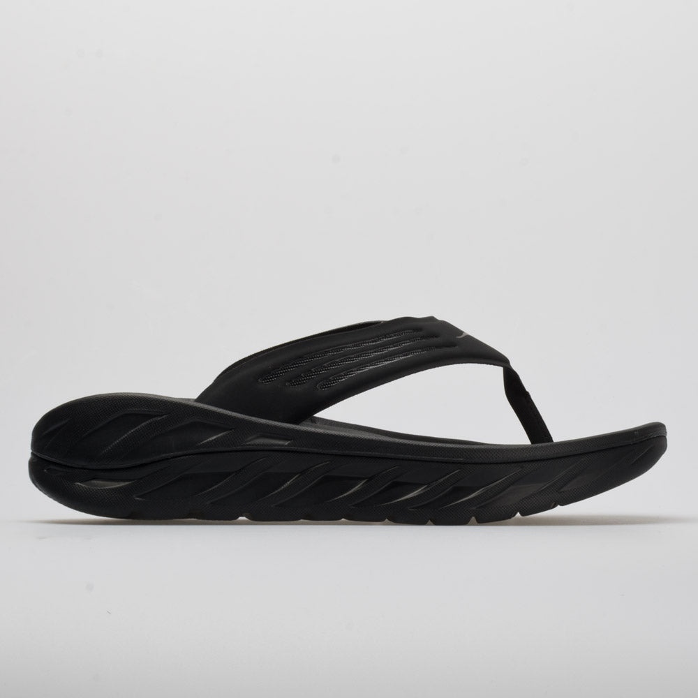 The Hoka One One Ora Recovery Flip is the perfect way help you rebound after a tough race. These slip-ons feature max cushioning from an oversized midsole and easy walking from the Meta-Rocker. Keep these handy to support those tired feet. Upper: Soft top layer EVA provides immediate step-in comfort. Midsole: Early-Stage Meta-Rocker delivers a smooth ride and increased propulsion. Features dual-layer construction. Outsole: Offers strategic groove placement for comfort and traction. PRODUCT SPECIFICATIONS - Color: Black/Dark Gull Gray - Weight: 5.8 Ounces - Item #: 570409 - Style #: 1099675-BDGGR US sales only. Item is returnable, but does not qualify for free returns.