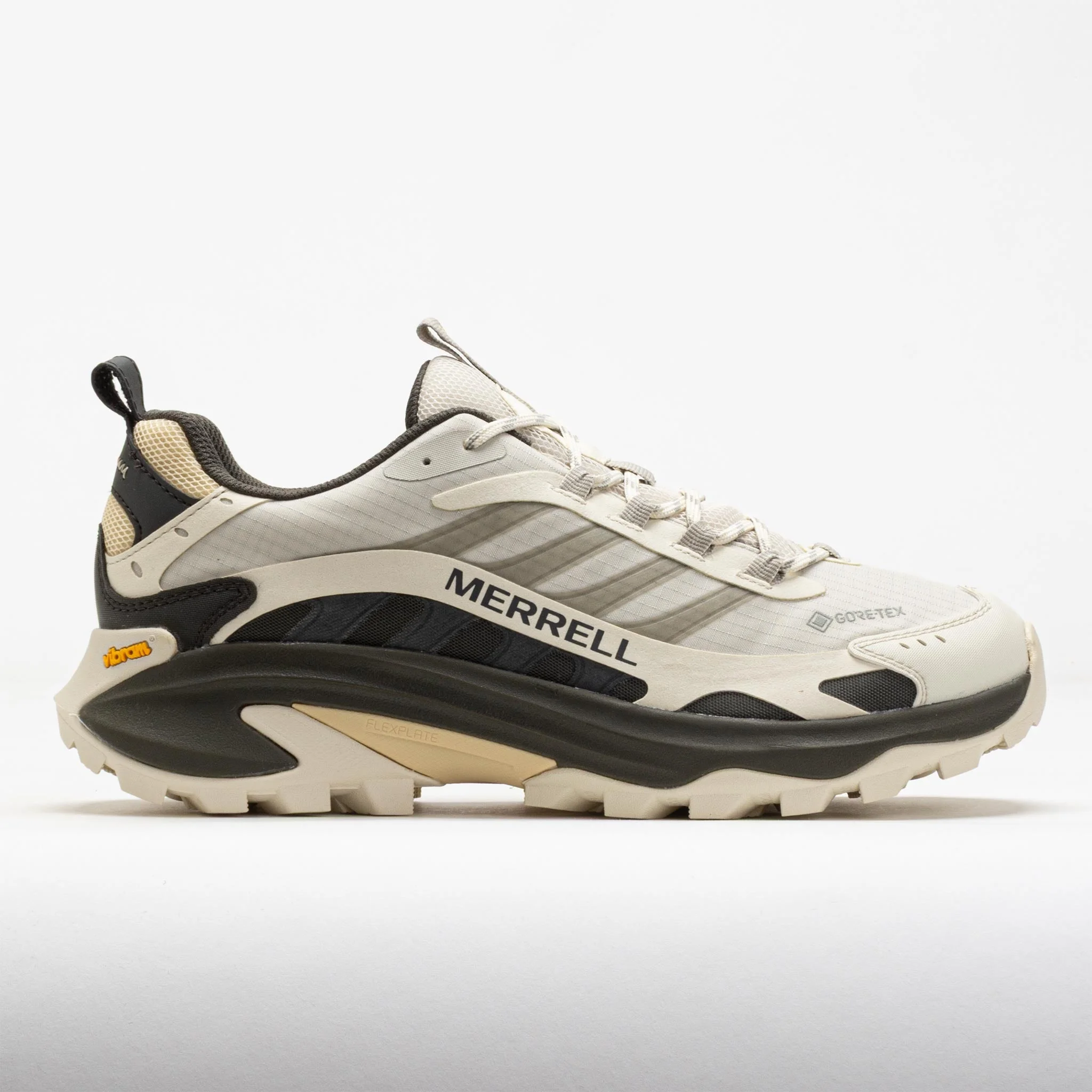 Tackle any terrain with the Merrell Moab Speed 2 GTX! This athletic hiker provides confident traction on any surface. Enjoy trail-ready protection in the nylon ripstop and TPU upper. Stay comfortable on your adventures as the FloatPro™ foam midsole absorbs shock from every step. Find secure footing on any surface under the Vibram TC5+ outsole. With trail-ready protection and a lightweight ride, the Merrell Moab Speed 2 GTX lets you be bold and explore the unknown! What's New? - 30% more midsole foam improves underfoot comfort. - Lightweight FlexPlate™ technology provides flexible rigidity and stability. - Vibram TC5+ outsole improves traction on outdoor surfaces. Shoe Technology Upper: Nylon ripstop and TPU upper provides trail-ready protection. GORE-TEX waterproof membrane offers exceptional breathability and waterproof protection. Made with 100% recycled laces, webbing, mesh lining, mesh footbed cover and 50% recycled removable EVA foam footbed. Padded collar adds step-in comfort. Bellows tongue keeps out debris. Abrasion-resistant synthetic heel and toe cap adds protection. Dual heel and tongue loops offer easy entry and carabiner compatibility. Cleansport NXT™ treated for natural odor control. Midsole: FloatPro™ foam midsole for long-lasting, lightweight comfort. Lightweight FlexPlate™ technology provides flexible rigidity and stability. Outsole: Vibram TC5+ outsole provides exceptional traction for outdoor multi-sport activities. Vibram® traction lugs increase grip and shed debris. PRODUCT SPECIFICATIONS - Color: Stucco - Weight: 12.9 Ounces (Size 9) - Item #: 631704 - Style #: J038329 US sales only.