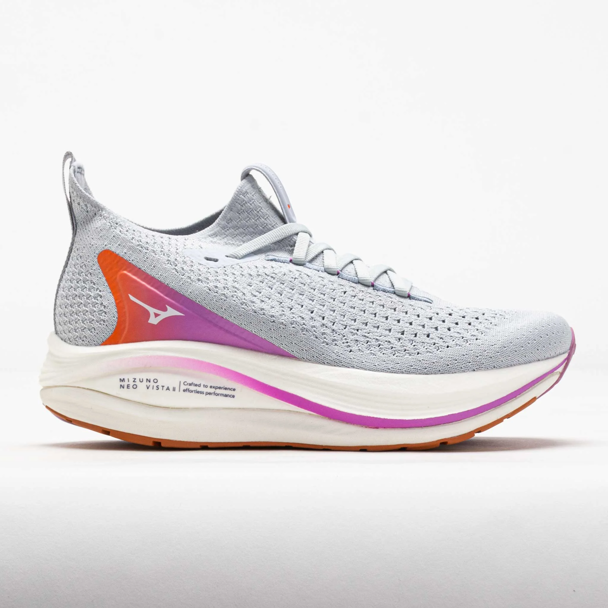 Find your flow in the Mizuno Neo Vista 2! This neutral running shoe is the perfect companion for long runs. Enjoy a secure and accommodating fit in the sleek engineered knit upper. Feel a soft and bouncy ride on the MIZUNO ENERZY NXT midsole. Smooth Speed Assist technology provides for effortless transitions at any pace. From long distances to mile repeats, the Mizuno Neo Vista 2 leads a smooth and responsive ride. What's New? - MIZUNO ENERZY NXT top layer features a nitrogen-infused TPU compound for a soft and responsive ride. EVA bottom layer adds stability for smooth landings. - Extra outsole rubber adds more coverage, while strategic cutouts reduce weight. - Engineered knit upper offers a more accommodating fit for various foot types. Who's it for? - Neutral runners looking for a daily trainer they can wear for all types of runs--from slow jogs to long runs and speed sessions. Shoe Technology Upper: Knit upper combines a sleek design and an accommodating fit for all foot types. Made with recycled materials for eco-friendly comfort. Midsole: MIZUNO ENERZY NXT provides maximum cushioning and energy return for soft landings. Glass fiber MIZUNO WAVE® plate disperses energy from impact to provide a stable platform. Smooth Speed Assist geometry features a significant heel bevel that encourages an efficient midfoot landing, while the aggressive forefoot rocker delivers a smooth and propulsive transition. Outsole: Rubber outsole provides reliable traction on road surfaces. PRODUCT SPECIFICATIONS - Support: neutral - Color: Arctic Ice/White - Forefoot Height: 37mm - Heel Height: 45mm - Offset: 8mm - Weight: 7.9 Ounces (Size 8) - Item #: 044047 - Style #: 411540.5700