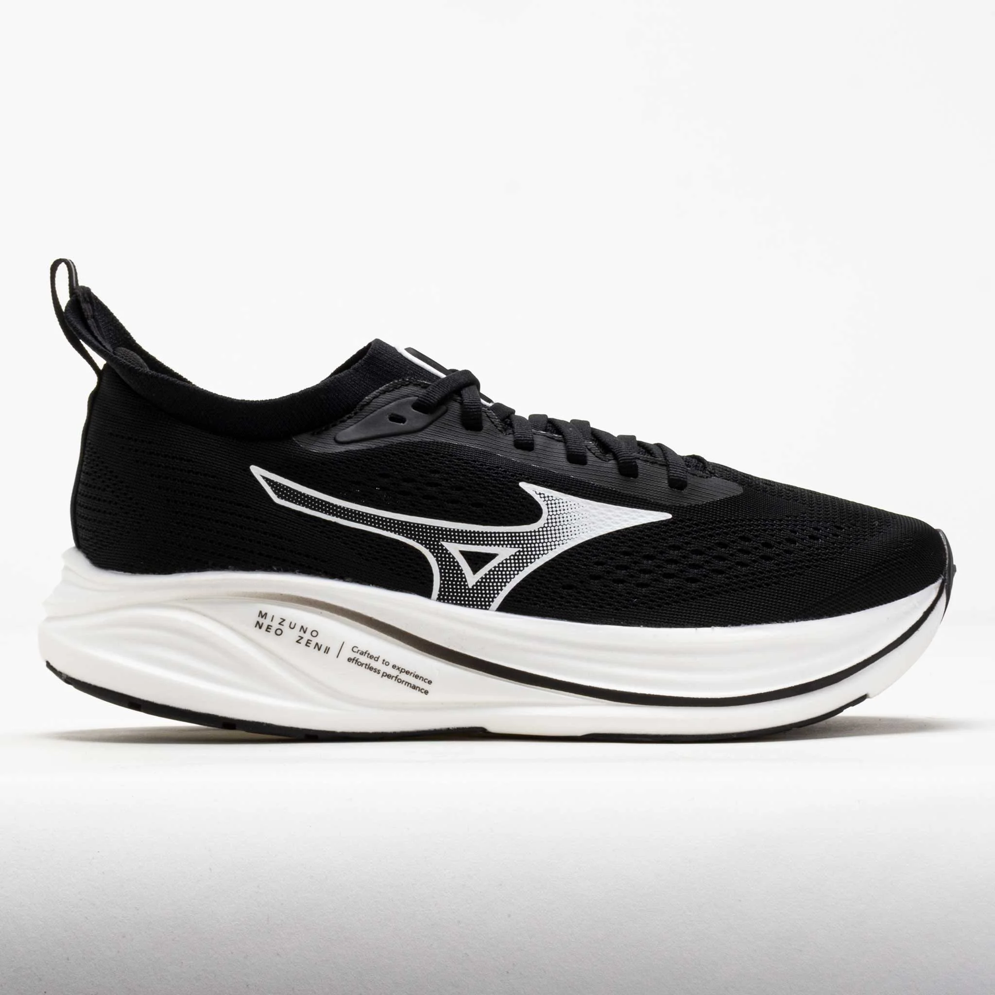 Feel the bounce with every stride in the Mizuno Neo Zen 2! This lightweight neutral running shoe combines smooth and efficient transitions with enhanced stability for daily training. Enjoy an accommodating fit in the breathable mesh and stretchy knit upper. The nitrogen-infused EVA midsole provides energy return and a strong ground feel, while SMOOTH SPEED ASSIST geometry aids an efficient gait. Whether you're pushing the pace or cruising easy miles, the Mizuno Neo Zen 2 helps you find peace in pursuit of your goals! What's New? - Redesigned upper combines mesh and stretchy knit for a more accommodating fit. - MIZUNO ENRZY NXT midsole made with nitrogen-infused EVA for a stable yet energetic ride. Who's it for? - Neutral runners looking for a super trainer to wear during swift daily miles. Shoe Technology Upper: Breathable mesh and stretchy knit upper offers an accommodating fit. Made with recycled materials to reduce carbon emissions. Midsole: MIZUNO ENERZY NXT with nitrogen-infused EVA provides energy return and a strong ground feel. SMOOTH SPEED ASSIST technology uses foot angle science to reduce calf strain and create smooth transitions. Outsole: X-10 rubber offers long-lasting traction. Wide base delivers a swift and stable ride. PRODUCT SPECIFICATIONS - Support: neutral - Color: Black/White - Offset: 6mm - Weight: 8.5 Ounces - Item #: 044052 - Style #: 411559.9000
