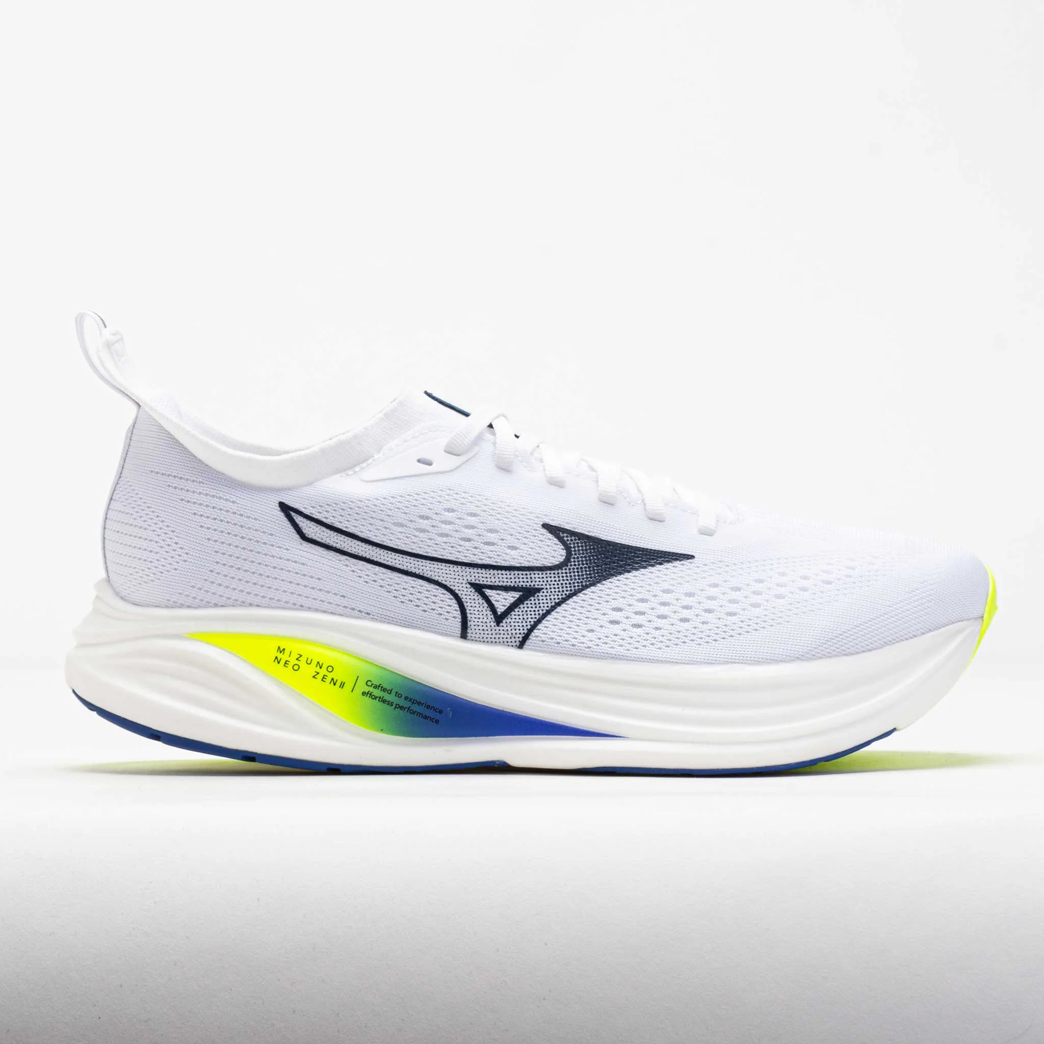 Feel the bounce with every stride in the Mizuno Neo Zen 2! This lightweight neutral running shoe combines smooth and efficient transitions with enhanced stability. Enjoy an accommodating fit in the breathable mesh and stretchy knit upper. The nitrogen-infused EVA midsole provides energy return and a strong ground feel, while SMOOTH SPEED ASSIST geometry aids an efficient gait. Whether you're pushing the pace or taking it slow, the Mizuno Neo Zen 2 helps you find peace in pursuit of your goals! What's New? - Redesigned upper combines mesh and stretchy knit for a more accommodating fit. - MIZUNO ENRZY NXT midsole made with nitrogen-infused EVA for a stable yet energetic ride. Who's it for? - Neutral runners looking for a super trainer to wear during swift daily miles. Shoe Technology Upper: Breathable mesh and stretchy knit upper offers an accommodating fit. Made with recycled materials to reduce carbon emissions. Midsole: MIZUNO ENERZY NXT with nitrogen-infused EVA provides energy return and a strong ground feel. SMOOTH SPEED ASSIST technology uses foot angle science to reduce calf strain and create smooth transitions. Outsole: X-10 rubber offers long-lasting traction. Wide base delivers a swift and stable ride. PRODUCT SPECIFICATIONS - Support: neutral - Color: White/Dazzling Blue - Forefoot Height: 34.5mm - Heel Height: 40.5mm - Offset: 6mm - Weight: 8.5 Ounces - Item #: 044050 - Style #: 411559.005B