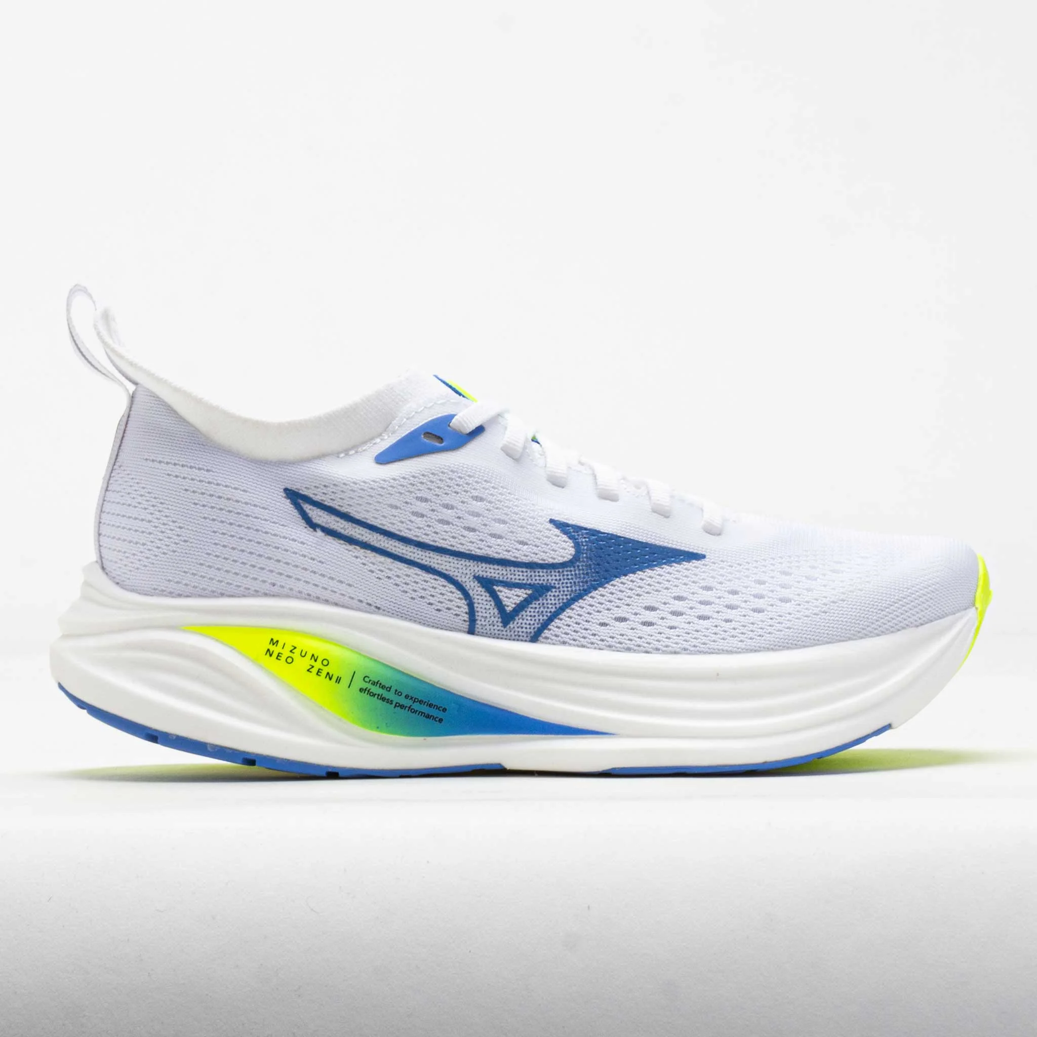 Feel the bounce with every stride in the Mizuno Neo Zen 2! This lightweight neutral running shoe combines smooth and efficient transitions with enhanced stability for daily training. Enjoy an accommodating fit in the breathable mesh and stretchy knit upper. The nitrogen-infused EVA midsole provides energy return and a strong ground feel, while SMOOTH SPEED ASSIST geometry aids an efficient gait. Whether you're pushing the pace or cruising easy miles, the Mizuno Neo Zen 2 helps you find peace in pursuit of your goals! What's New? - Redesigned upper blends breathable mesh and stretchy knit for a more accommodating fit. - MIZUNO ENRZY NXT midsole made with nitrogen-infused EVA for a stable yet energetic ride. Who's it for? - Neutral runners looking for a super trainer to wear during swift daily miles. Shoe Technology Upper: Breathable mesh and stretchy knit upper offers an accommodating fit. Made with recycled materials to reduce carbon emissions. Midsole: MIZUNO ENERZY NXT with nitrogen-infused EVA provides energy return and a strong ground feel. SMOOTH SPEED ASSIST technology uses foot angle science to reduce calf strain and create smooth transitions. Outsole: X-10 rubber offers long-lasting traction. Wide base delivers a swift and stable ride. PRODUCT SPECIFICATIONS - Support: neutral - Color: White/Ultramarine - Forefoot Height: 34.5mm - Heel Height: 40.5mm - Offset: 6mm - Weight: 7.4 Ounces - Item #: 044055 - Style #: 411560.00UM
