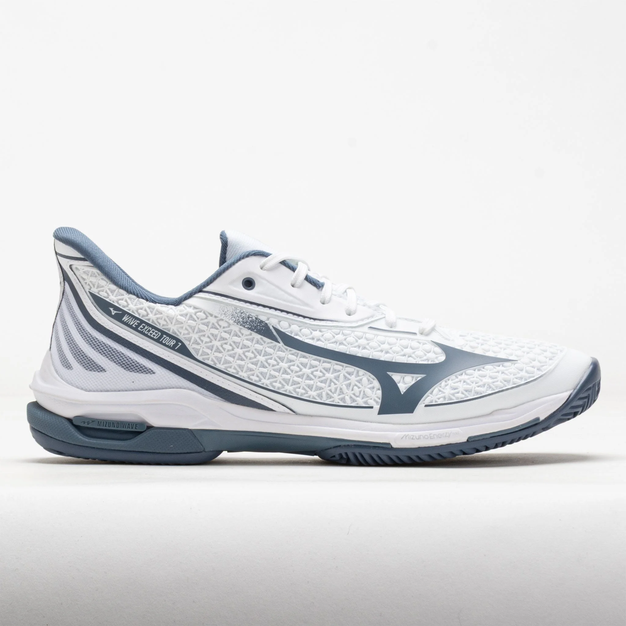 Elevate your standards in the Mizuno Wave Exceed Tour 7 Clay! This speedy tennis shoe is the perfect match for fleet-footed players. Feel quick and explosive with every move under the MIZUNO ENERZY XP midsole. MIZUNO WAVE Technology provides a stable platform, while the DX rubber outsole adds durability for aggressive moves. Light, flexible and explosive, the Mizuno Wave Exceed Tour 7 Clay turns your power into lightning-fast movement during the match! What's New? - Longer, softer and more cushioned tongue and redesigned CPU upper elevate flexibility and step-in comfort. - DX rubber outsole enables effortless slides, stops and pivots on the court. Who's it for? - Speedy players who want more support for explosive on-court movements. - Tennis players who prefer a mix of cushion, support, and speed from their court shoes. Shoe Technology Upper: CPU offers flexibility and support. Thicker tongue improves step-in comfort. Refined lacing pattern secures the fit. Midsole: MIZUNO ENERZY XP in the heel and forefoot offers superior comfort and energy return. MIZUNO ENERZY NXT midsole provides energetic cushioning for a light and explosive ride. Mizuno Wave® plate disperses energy from impact to provide a stable platform. PoWnCe lightweight midsole material adds comfort and responsiveness. Outsole: DX rubber outsole supports aggressive movements on the court. D-Flex groove enhances lateral stability for quick pivots and turns. 6-month outsole warranty. PRODUCT SPECIFICATIONS - Color: White/China Blue - Weight: 11.6 Ounces (Size 9) - Item #: 118778 - Style #: 550120.00CL