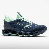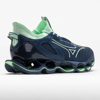 Stride into future comfort with the Mizuno Wave Prophecy 14! This neutral running shoe combines comfort and support with eco-friendly materials. Slide into a sleek monofilament mesh upper with synthetic leather details for style. Enjoy plush cushioning from the plant-based Wave Plate made from Pebax Rnew®. The full-length INFINITY WAVE adds comfort and stability to every stride. Fast, supportive and comfortable, the Mizuno Wave Prophecy 14 elevates your runs! Shoe Technology Upper: Layered Monofilament Mesh upper offers excellent comfort and breathability. Made with eco-friendly materials for sustainability. Midsole: U4ic midsole delivers optimal shock absorption, durability and a superior ride. U4icX Strobel Lasting Board ensures a comfortable underfoot feel. Infinity Wave Plate absorbs impact at foot strike for excellent cushioning and improved durability. Plant-Based Wave Plate made with Pebax Rnew® disperses energy from impact to create a stable platform and plush cushioning. Outsole: WGrip Outsole offers excellent durability and grip in both wet and dry conditions. X10 outsole includes durable carbon rubber that extends longevity. PRODUCT SPECIFICATIONS - Support: neutral - Color: Vintage Indigo/Bay - Forefoot Height: 27.5mm - Heel Height: 38mm - Offset: 10.5mm - Weight: 10.6 Ounces - Item #: 042774 - Style #: 411505.8Z59