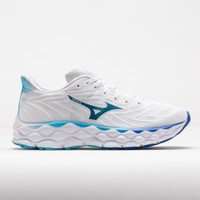 Float above all obstacles in the Mizuno Wave Sky 8! This max-cushioned neutral running shoe is the perfect daily training partner. Enjoy lightweight comfort and a secure fit in the Smooth Stretch Woven upper. Feel a softer, more responsive ride on the MIZUNO ENERZY NXT midsole. The dual-layer Foam Wave features a U4icX top layer and Mizuno Enerzy bottom layer for comfort and support. With cloud-like cushion and foot-hugging upper, the Mizuno Wave Sky 8 is a true comfort cruiser! What's New? - MIZUNO ENERZY NXT foam provides a softer, more responsive ride. - SMOOTH STRETCH WOVEN upper offers lightweight comfort and a secure fit. Who's it for? - Neutral runners who want a soft and responsive shoe to wear during daily training. - Mizuno runners who want a shoe with even more cushion and softness than the popular Wave Rider. Shoe Technology Upper: Smooth Stretch woven upper offers a soft and secure fit. Stretchy gusseted tongue hugs the foot for a secure and comfortable lockdown. Made with more than 70% recycled content on the upper body textile and more than 90% on the upper body lining textile and sockliner lining. Midsole: MIZUNO ENERZY NXT foam provides a soft and energetic ride. Dual-layer foam Wave with a U4iCx top layer and MIZUNO ENERZY bottom layer for comfort and support. Outsole: X10 rubber outsole provides durability for daily training and high weekly mileage. PRODUCT SPECIFICATIONS - Support: neutral - Color: White/Mercury Blue - Forefoot Height: 33mm - Heel Height: 41mm - Offset: 8mm - Weight: 8.3 Ounces (Size 8) - Item #: 041649 - Style #: 411463.00MR