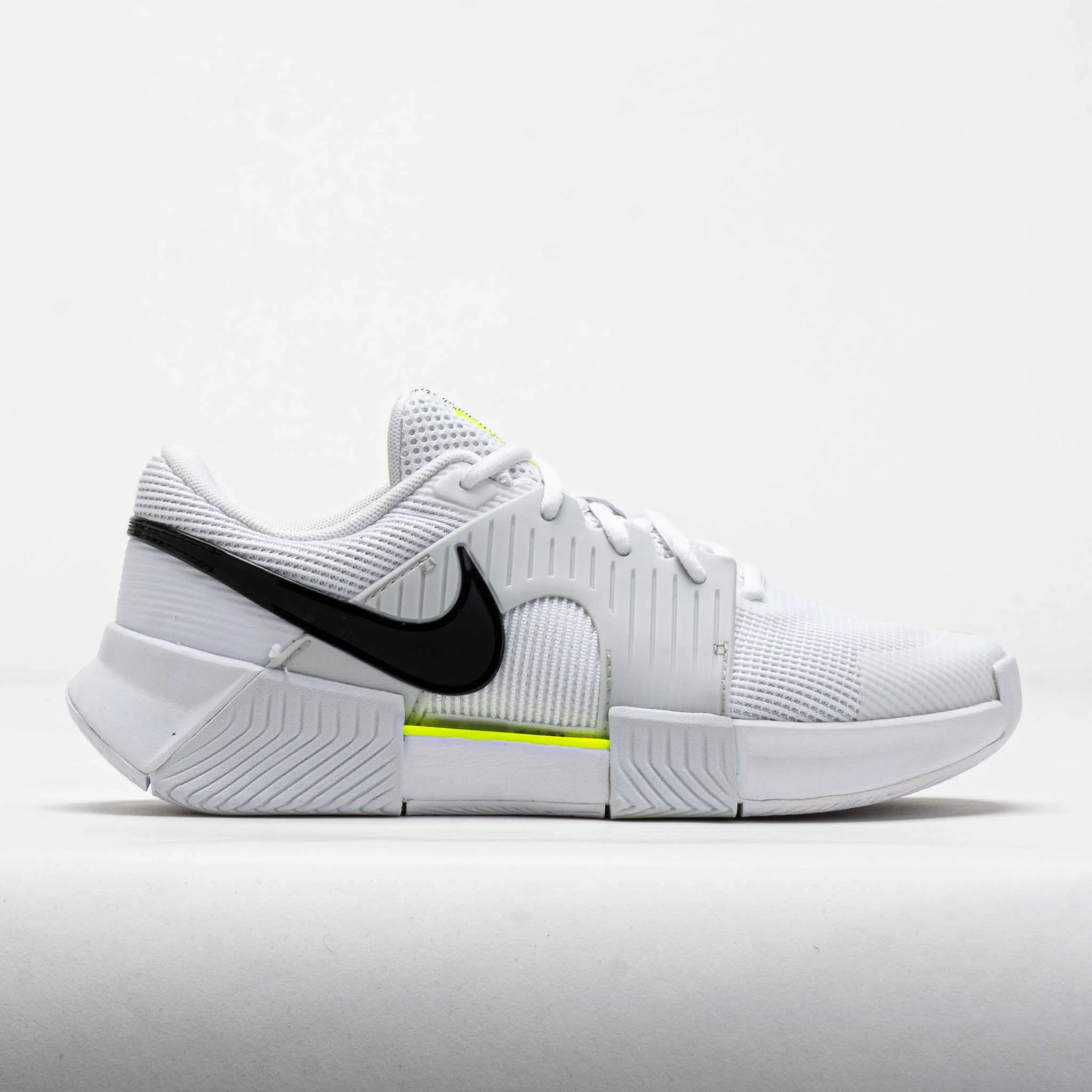 Play with confidence in the Nike GP Challenge 1.5! Packed with Air Zoom units and lateral support, this tennis shoe ignites your inner strength. Whether you're at the net, along the baseline or even in no man's land, the Nike GP Challenge 1.5 helps you attack whatever comes your way! What's New? - Updated toe skin increases durability in high-wear areas. - Gusseted tongue adds security during aggressive sprints and slides. - Specifically designed heel supports rocker-like movements, like pulling back for a serve. - Updated upper offers a more spacious forefoot for improved comfort. Who's it for? - Tennis players who want a versatile shoe that combines support, comfort and style during the match. Shoe Technology - Air Zoom unit in the forefoot helps you play on your toes and puts a spring in your step. - Air Zoom unit in the heel provides support. - Strong midfoot plastic plate adds stability for quick and powerful cuts. Webbing around the eyestays combines with the plate for lateral support. - Padded heel adds comfort and support. - Extra rubber in the medial toe area helps avoid excessive wear and tear. - High-abrasion rubber in the forefoot offers durability and traction. PRODUCT SPECIFICATIONS - Color: White/Black/Pure Platinum/Volt - Weight: 12.1 Ounces (Size 7) - Item #: 119358 - Style #: IQ5176-100