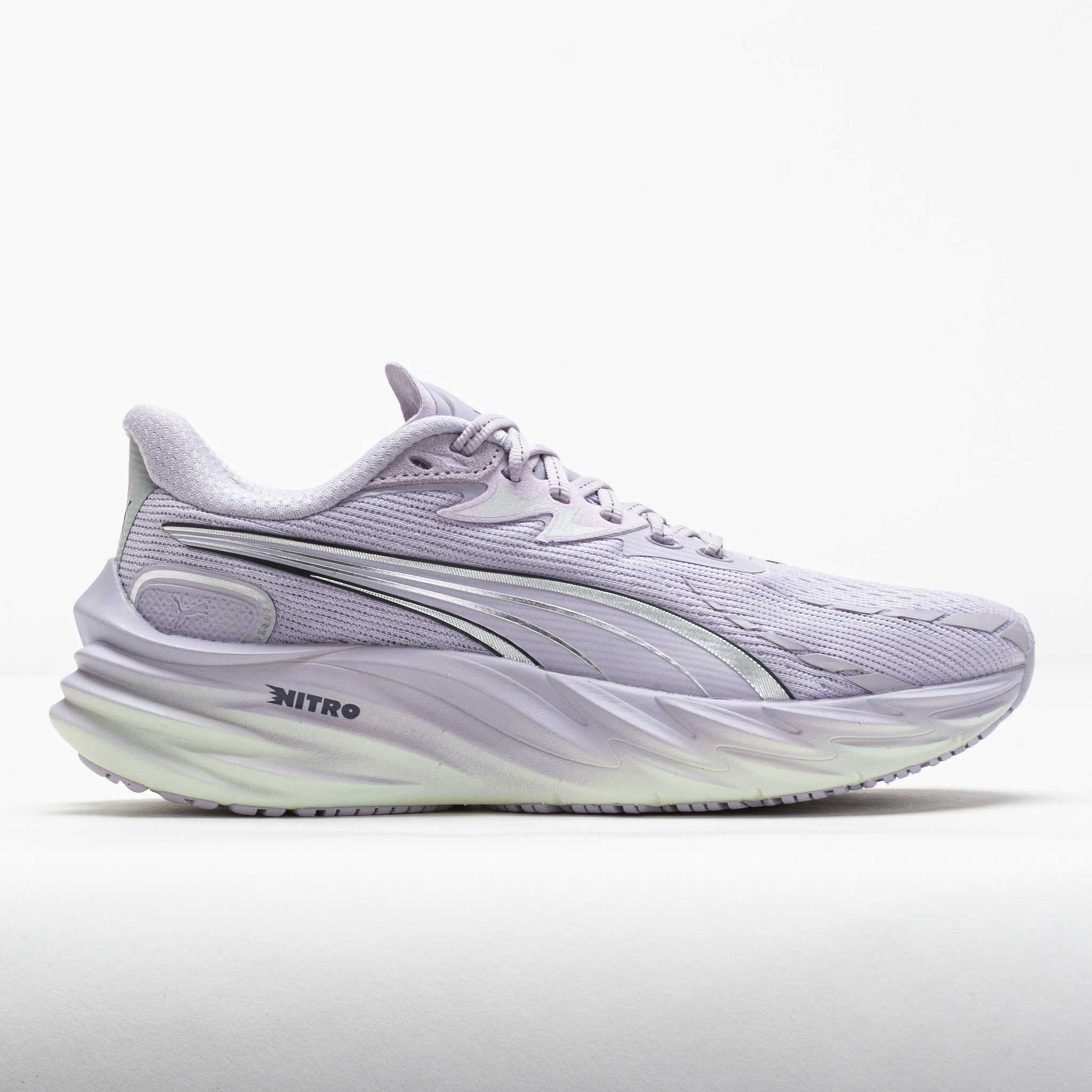 Unleash your inner speed in the PUMA Velocity Nitro 4! Comfortable at any pace, this neutral running shoe handles tempo sessions, recovery days and everything in between. Enjoy a secure fit while you sprint in the engineered mesh upper. A full-length NITRO midsole offers a light and responsive ride, while the PUMAGRIP outsole provides multi-surface traction. From the treadmill to the track, the versatile PUMA Velocity Nitro 4 thrives on any surface! What's New? - The PUMA Velocity Nitro 4 is lighter than its predecessor, improving responsiveness to reach the runner's high. - Mesh upper improves breathability to keep you comfortable. - Full-length NITROFOAM™ midsole adds responsiveness for a more agile ride. Who's it for? - Neutral runners searching for a versatile daily workhorse that can handle various running workouts. Shoe Technology Upper: Engineered knit upper provides stretch and breathability. PWRTAPE reinforcements create a secure and durable lockdown. Made with at least 30% recycled materials for sustainability. Midsole: NITROFOAM™ offers explosive energy return for an effortless ride. Outsole: Durable PUMAGRIP rubber provides multi-surface traction. PRODUCT SPECIFICATIONS - Support: neutral - Color: Lilac Crush/Sage Frost - Forefoot Height: 26mm - Heel Height: 36mm - Offset: 10mm - Weight: 6.9 Ounces (Size 8) - Item #: 043524 - Style #: 311141-11