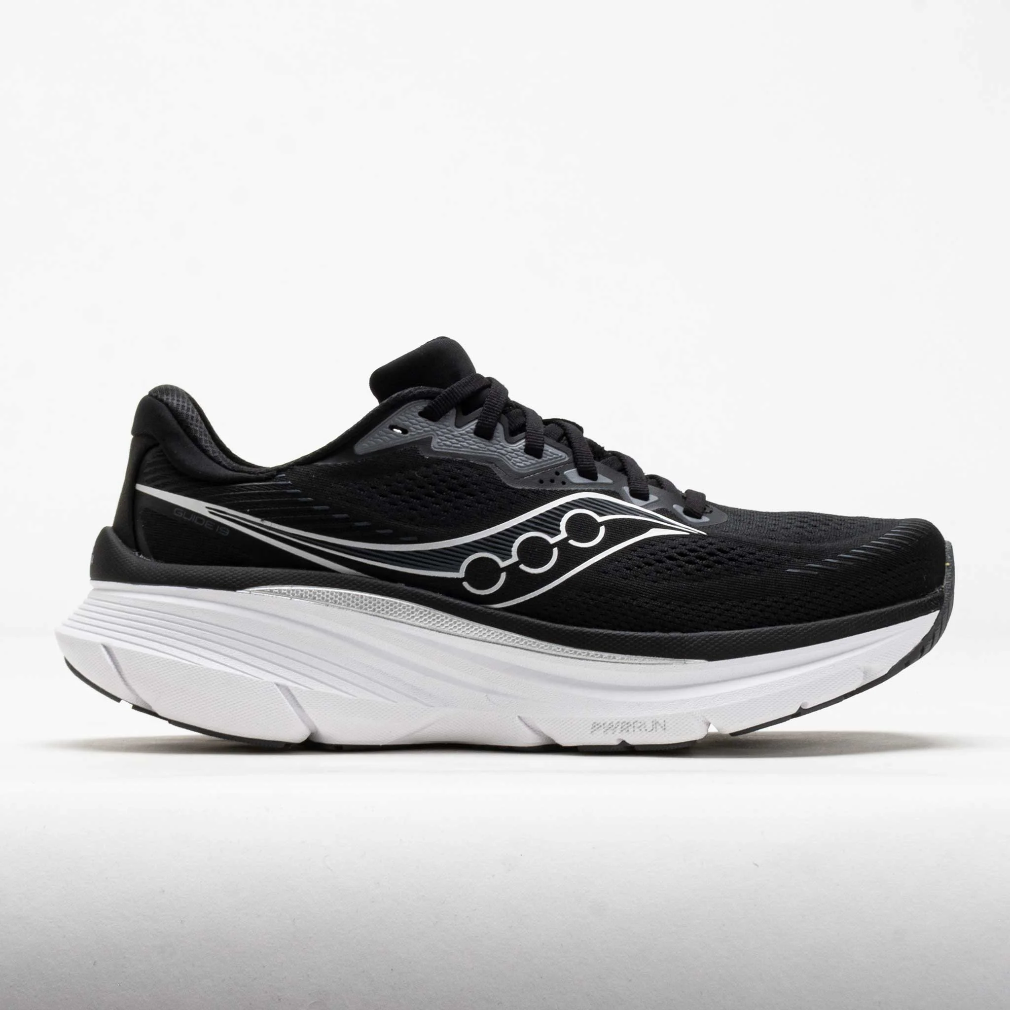 Build your confidence with every stride in the Saucony Guide 19! This max-cushioned support shoe offers an inherently stable ride. Enjoy a secure and stretchy fit in the engineered mesh upper. CenterPath technology combines a wider platform and higher sidewalls for smooth landings. Get more durability for daily miles with extra rubber on the outsole. Plush and protective, the Saucony Guide 19 keeps you on the right track! What's New? - Softer blend of PWRRUN foam enhances comfort with every stride. - Improved forefoot flexibility provides smoother transitions. - Extra outsole rubber adds durability for daily miles. Who's it for? - Runners who slightly overpronate and need lightweight support for their stride. - Runners with a diverse workout routine that includes various distances, speeds, and intervals. - Anyone with a wide foot wants a shoe that can accommodate without sacrificing comfort. Key Features: - Fresh Foam: Softer, more responsive PWRRUN foam improves comfort with every stride. - CenterPath Technology: Broad platform and higher sidewalls guide your foot through every step. - Adaptable Upper: Engineered mesh upper provides stretch and breathability for a flexible fit. Added collar provides comfort and security. PRODUCT SPECIFICATIONS - Support: support - Color: Black/Silver - Forefoot Height: 33mm - Heel Height: 39mm - Offset: 6mm - Weight: 8.9 Ounces - Item #: 043845 - Style #: S21058-100
