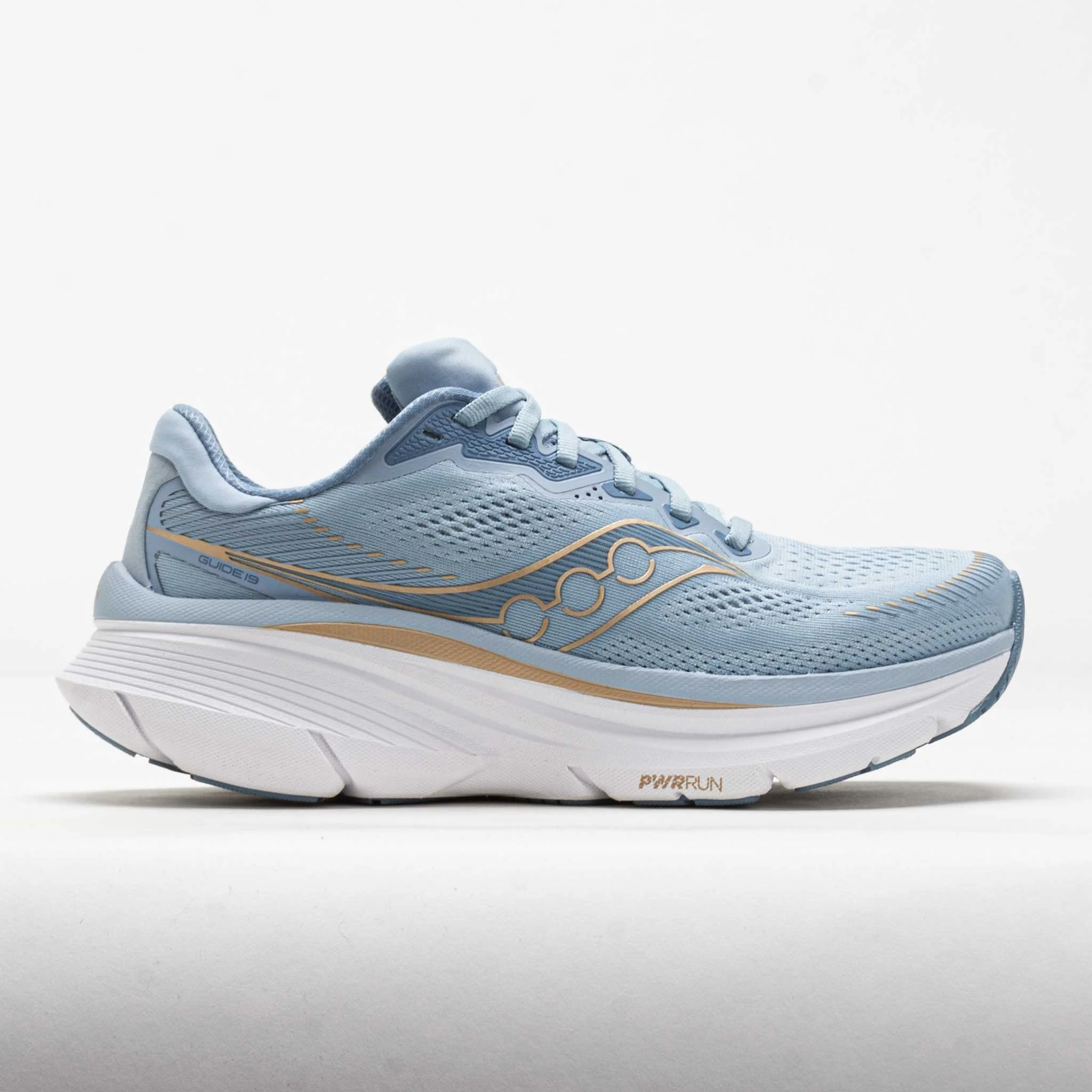 Grow your confidence with every stride in the Saucony Guide 19! This max-cushioned support shoe offers an inherently stable ride. Enjoy a secure and stretchy fit in the engineered mesh upper. CenterPath technology combines a wider platform and higher sidewalls for smooth landings. Get more durability for daily miles with extra rubber on the outsole. Plush and protective, the Saucony Guide 19 keeps you on the right track! What's New? - Softer blend of PWRRUN foam enhances comfort with every stride. - Improved forefoot flexibility provides smoother transitions. - Extra outsole rubber adds durability for daily miles. Who's it for? - Runners who slightly overpronate and need lightweight support for their stride. - Runners with a diverse workout routine that includes various distances, speeds, and intervals. - Anyone with a wide foot wants a shoe that can accommodate without sacrificing comfort. Key Features: - Fresh Foam: Softer, more responsive PWRRUN foam improves comfort with every stride. - CenterPath Technology: Broad platform and higher sidewalls guide your foot through every step. - Adaptable Upper: Engineered mesh upper provides stretch and breathability for an accommodating fit. Added collar provides a secure and comfortable fit. PRODUCT SPECIFICATIONS - Support: support - Color: Celestial - Forefoot Height: 33mm - Heel Height: 39mm - Offset: 6mm - Weight: 8.9 Ounces - Item #: 043853 - Style #: S11058-142