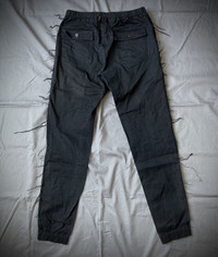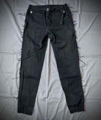 A pair of jogger pants from Takahiro Miyashita TheSoloist’s summer/spring 2018 collection. Miyashita was able to redesign a pair of simple jogger pants and give it a grunge look by adding fringe detailings on the side of the pants changing the entire aesthetic. A belt is attached to the waistband for adjustable sizing. All sales are shipped within 24 hours. All sales are final. Offers are welcomed. Feel free to reach out for any inquiries. - @HoldenPieces