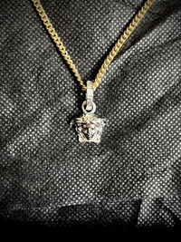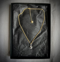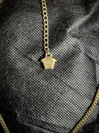 Signature carved Medusa pendant necklace from Versace in silver tone on a curb chain in gold tone. The necklace is approximately 18" full length. Uses lobster clasp fastening with the signature Medusa head on the end of the chain as well. This product is brand new and comes with original box and authentication papers. Note: The box is in the photo is not the original box. It was simply used for a clearer background. Necklace would be shipped in its original box. All sales are shipped within 24 hours. All sales are final. Price is final for this item. Feel free to reach out for any inquiries. - @HoldenPieces