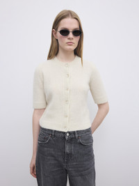 Short-sleeved cardigan made from silky and lush, brushed Italian alpaca featuring a gently fitted frame, crew neckline, and three-quarter length sleeves. Ribbing at collar, cuffs and hem. FIT & SIZING Model is 179 cm / 5'10.5" and is wearing a size S, UK 8, US 4 MATERIAL 40% Baby Alpaca 25%Extrafine Wool 35% Polyamide GARMENT CARE Handwash cold