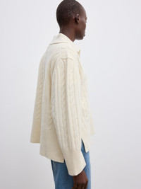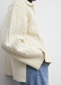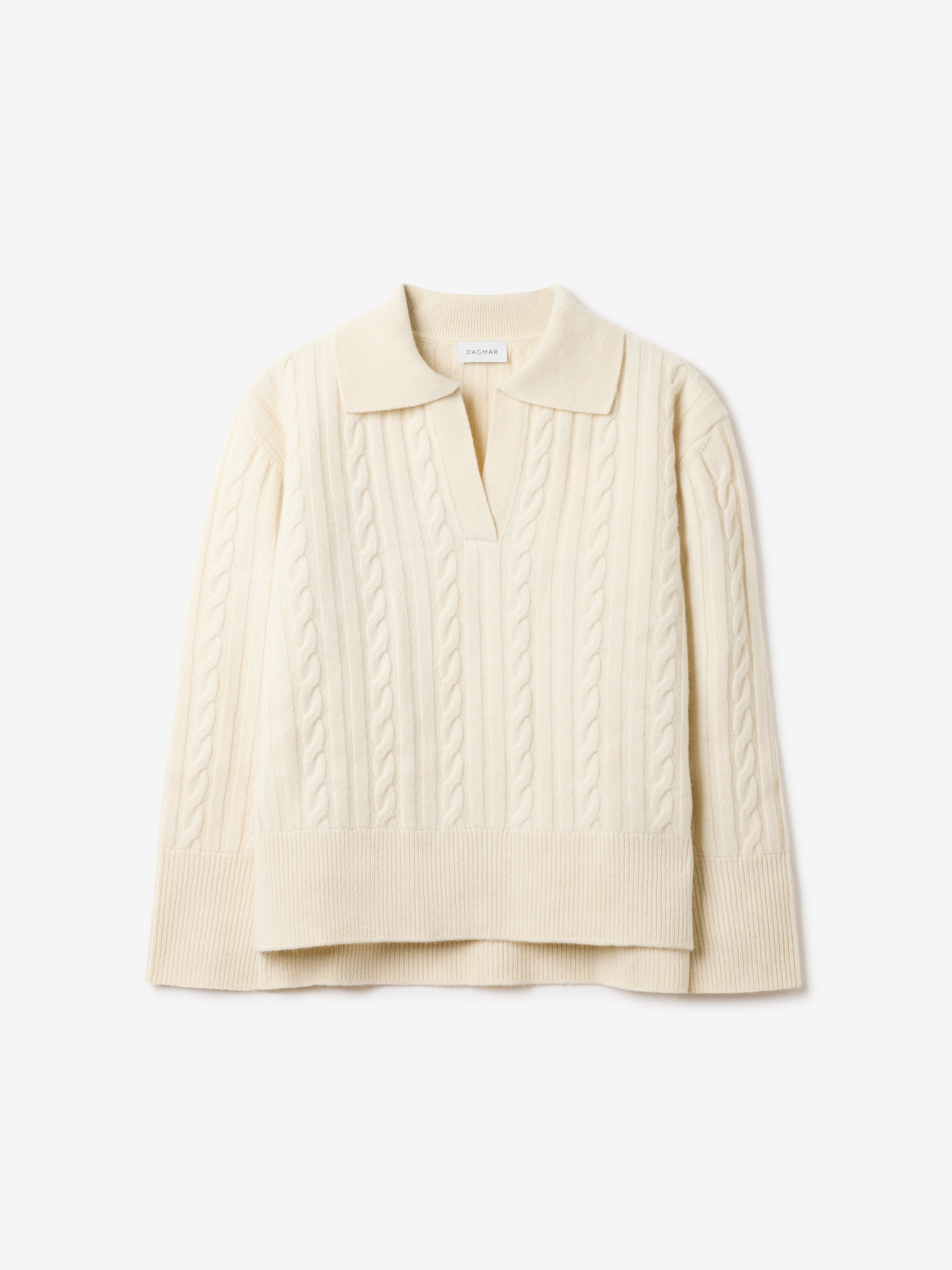 Online Exclusive - Cable knitted polo from a soft cashmere and wool blend with a mixture of faded cables in a unique pattern by Dagmar’ s in-house knitting atelier. Featuring polo neck and slit at sides. FIT & SIZING Model is 175cm/ 5'7" and is wearing a size S, UK 8, US 4. MATERIAL 50% Wool, 50% Cashmere. GARMENT CARE Manually handwash cold, dry flat. GARMENT ORIGIN Produced in Italy