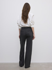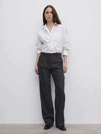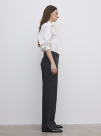 Low-rise tailored trousers made from wool blend with a straight leg, pressed front and back creases, front slash pockets, and back welt pockets. - Low waist - Pressed front and back creases - Relaxed, straight leg - Belt loops - Side and front pockets - Zipper fly FIT & SIZING Model is 177 cm / 5'8" and is wearing a size 36, UK 10, US 6. MATERIAL 43%Wool 24%Polyester, 19%Polyolefin 11%Viscose, 2% Of 1%Ea GARMENT CARE Machine wash 30 GARMENT ORIGIN Produced in Portugal