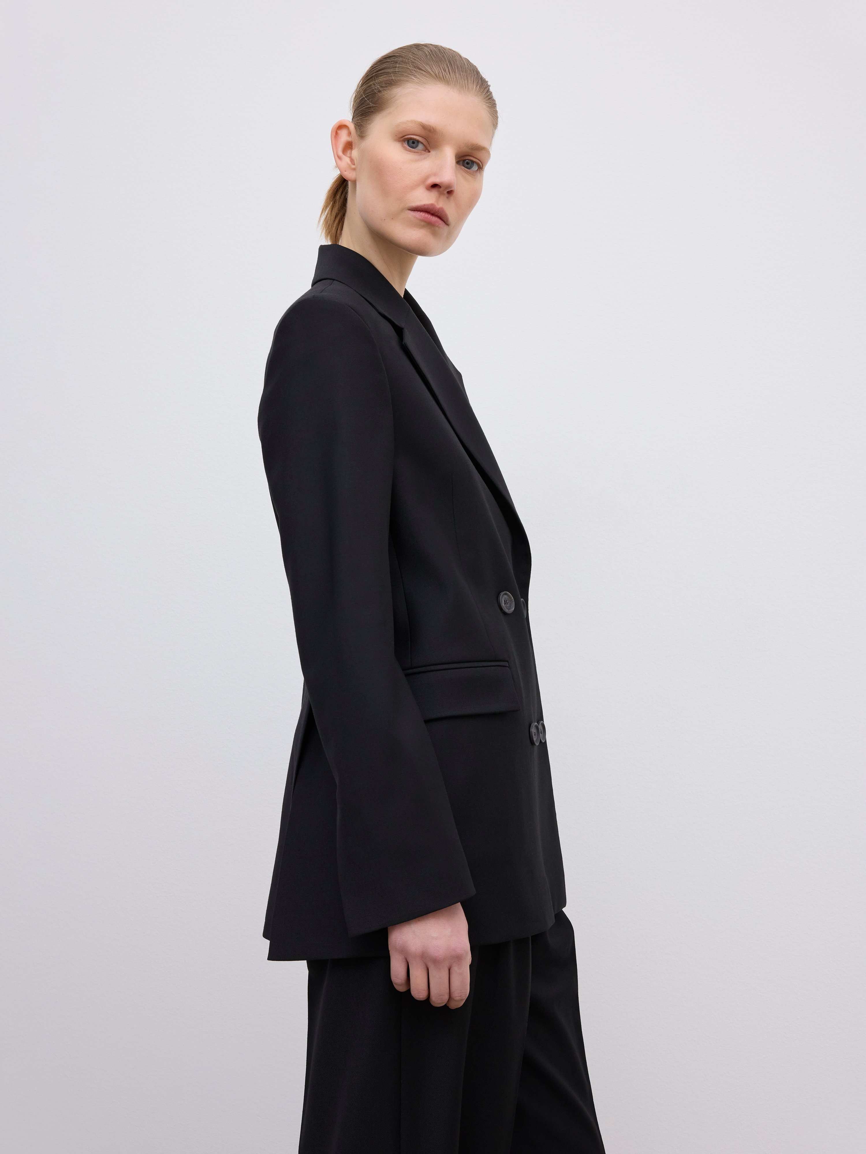 Tailored double-breasted blazer in lightweight wool suiting. A wardrobe icon, complete with notched lapels, flap pockets and back vents. Fully lined. FIT & SIZING Model is 175cm/ 5'7" and is wearing a size 36, UK 8, US 4. MATERIAL 54% Recycled polyester, 44% Virgin wool, 2% Elastane GARMENT ORIGIN Produced in Portugal