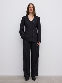 Collarless blazer made from a wool blend with a fitted frame, rounded neckline and softly tailored shoulders. Fully lined. FIT & SIZING Dry clean only MATERIAL 54% Recycled polyester 44% Virgin wool, 2% Elastane GARMENT ORIGIN Produced in Portugal