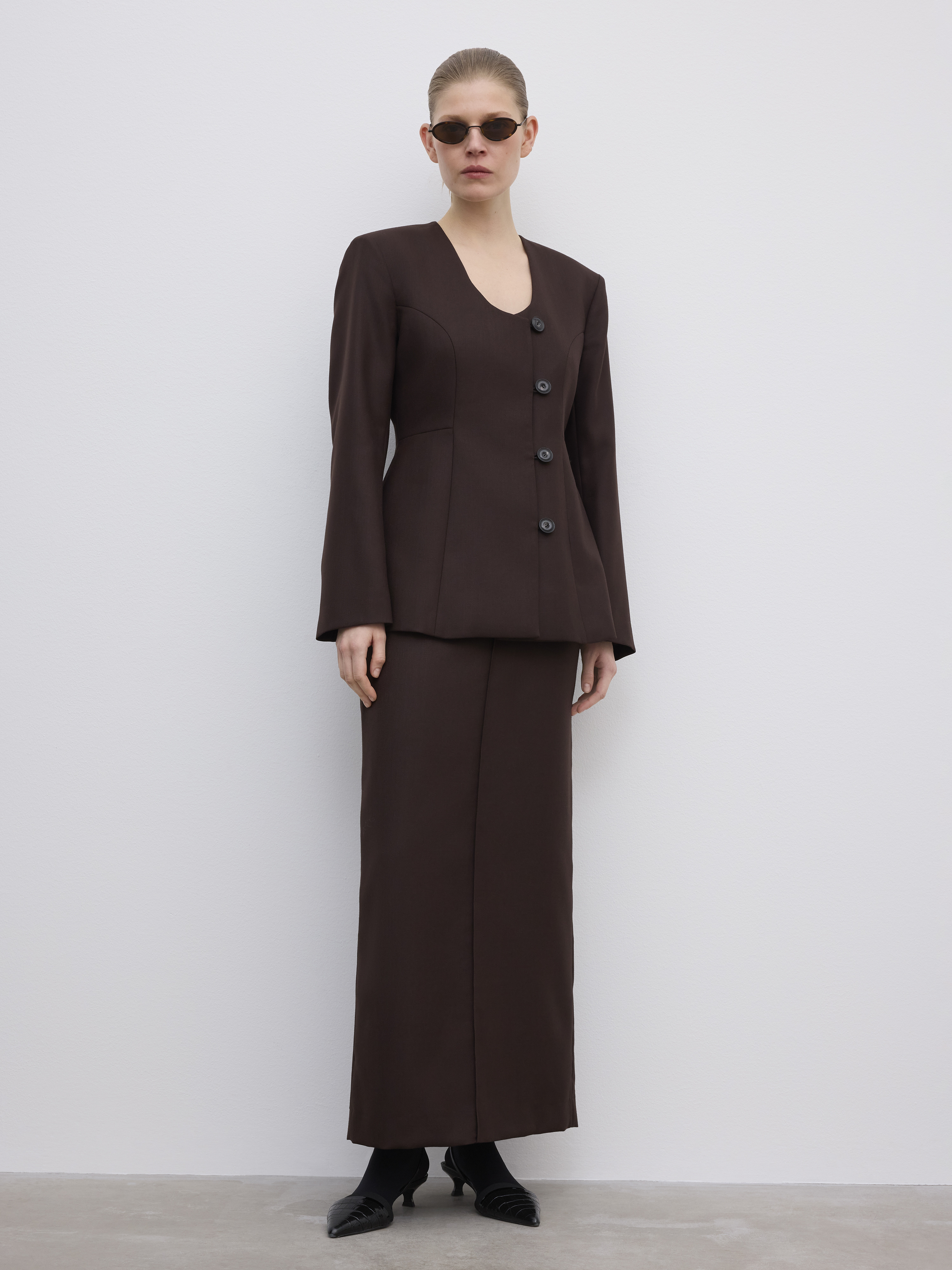Limited edition piece. Collarless blazer made from a wool blend with a fitted frame, rounded neckline and softly tailored shoulders. Fully lined. FIT & SIZING Model is 175 cm / 5'7" and is wearing a size 36, UK 8, US 4. MATERIAL 54% Recycled polyester 44% Virgin wool, 2% Elastane GARMENT ORIGIN Produced in Portugal