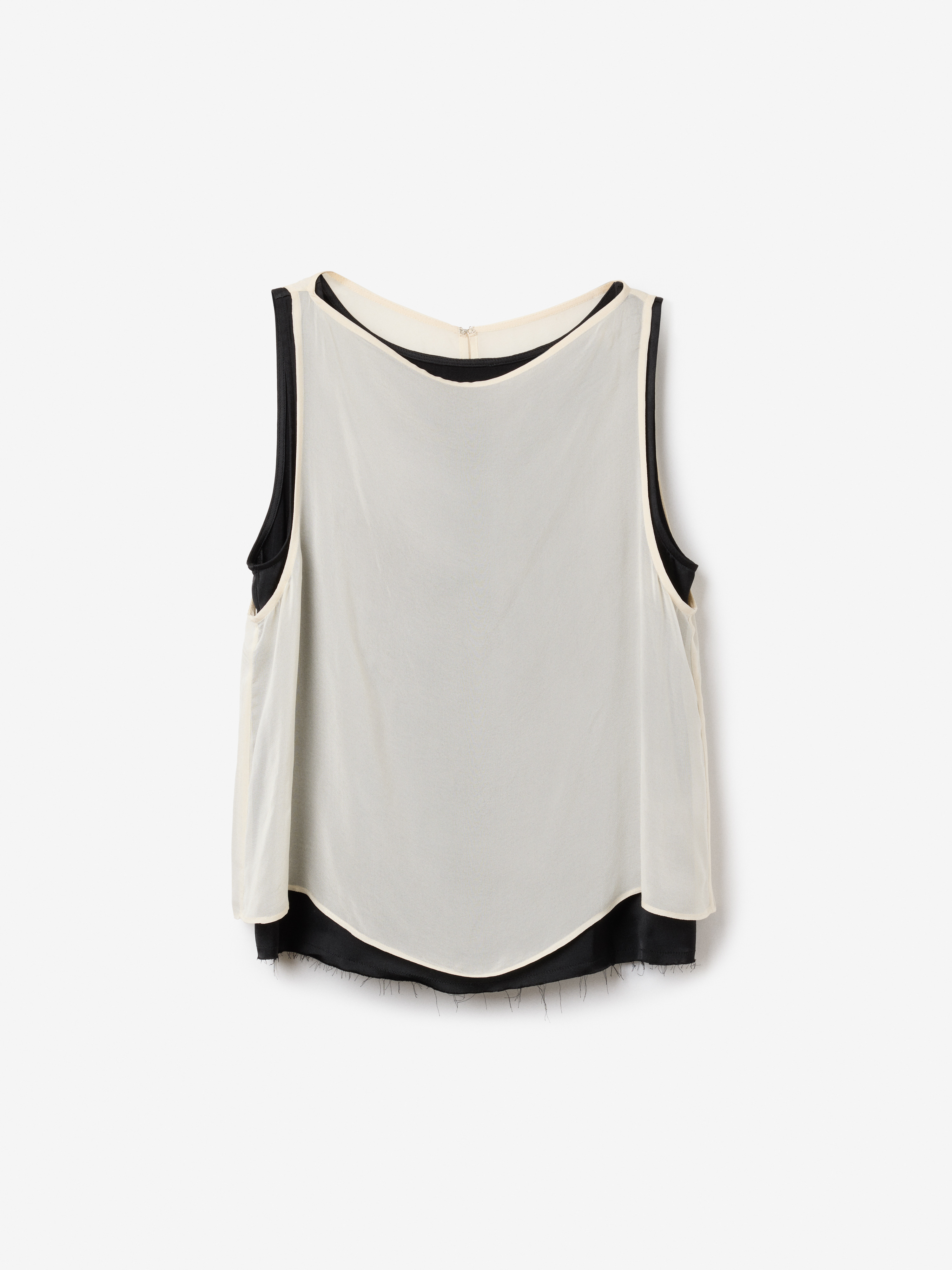 Sleeveless top made from two-toned Italian chiffon, characterised by a sheer layer, slit opening at the back and raw-edged hem. MATERIAL Top Layer: 100%Viscose Bottom Layer: 59% Viscose 41% Polyester GARMENT CARE Dry clean GARMENT ORIGIN Produced in Portugal