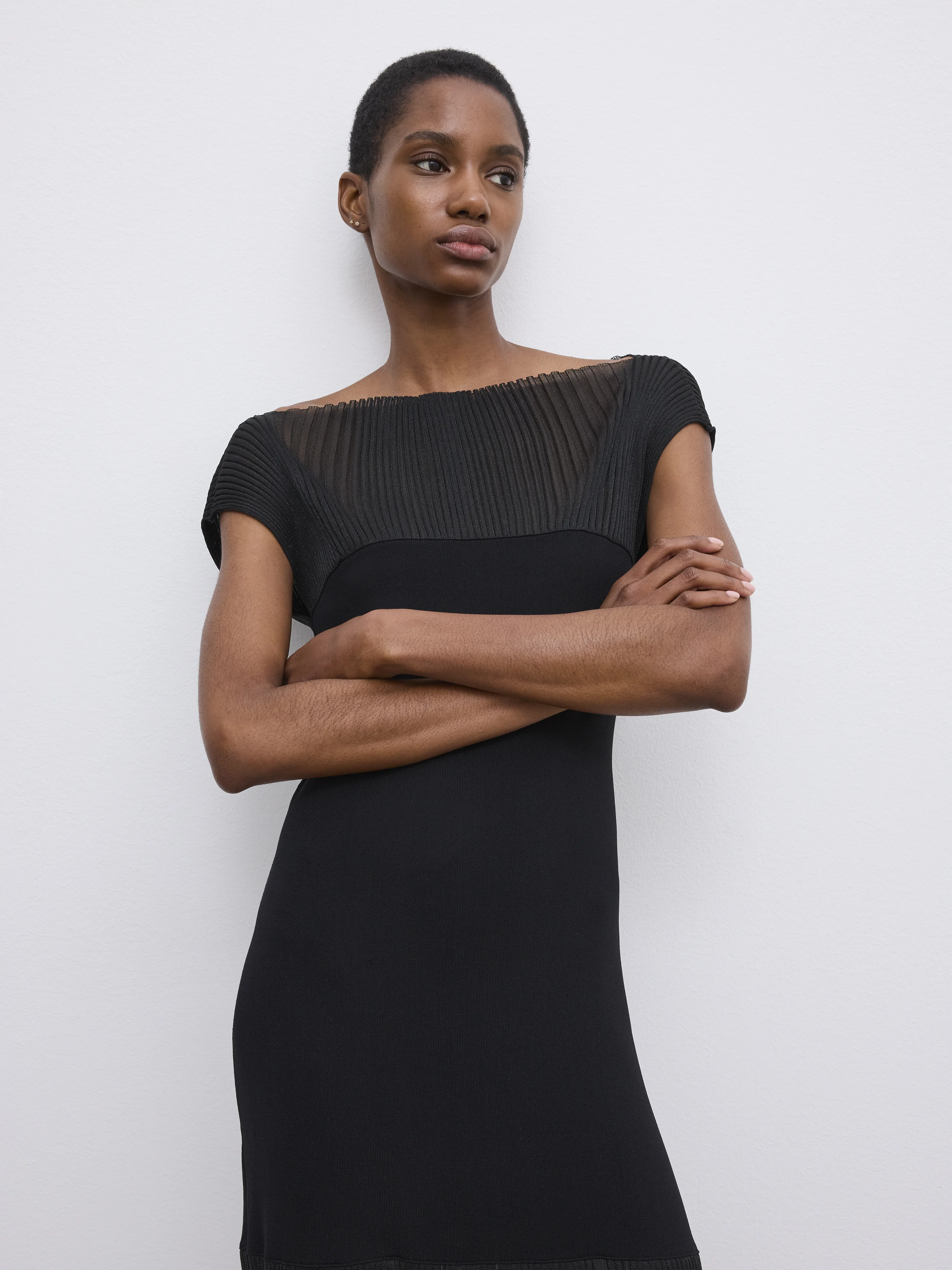 Full-length knit dress rendered with a sculpting middle and sheer, lustrous, ribbed tiers, fanning out into a textural shift. FIT & SIZING Model is 178 cm / 5'10" and is wearing a size 36, UK 8, US 4. MATERIAL 63% Viscose 37% Nylon GARMENT CARE Dry clean GARMENT ORIGIN Produced in Hong Kong SAR China