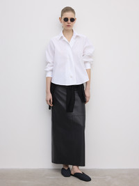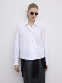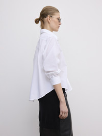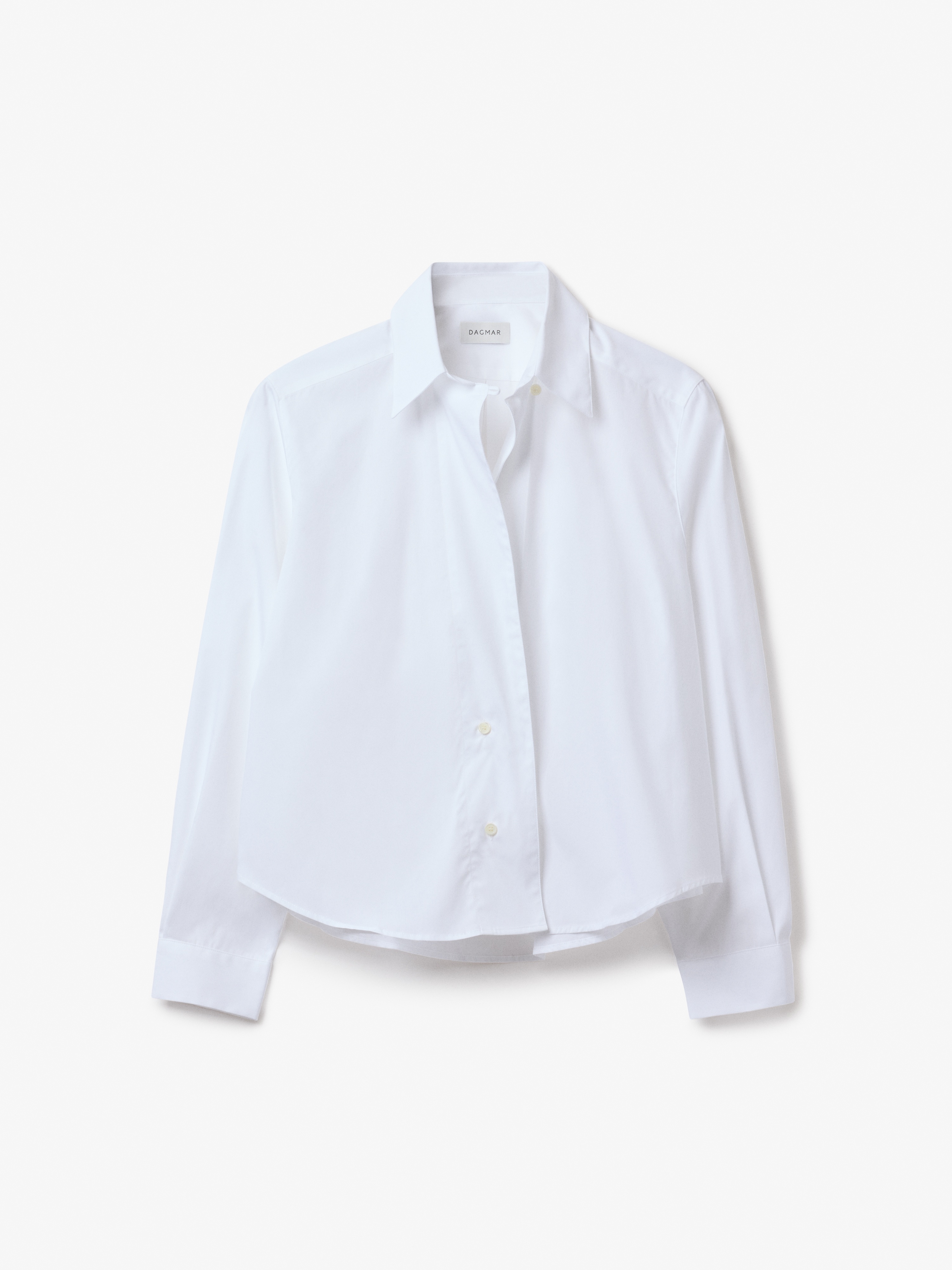 Button-up shirt in crisp organic cotton poplin with a relaxed and slightly cropped fit, asymmetric fold-over collar, and a three-button front honouring Dagmar’s three founding sisters. Signature logo on the side FIT & SIZING Model is 176 cm/ 5'7" and is wearing a size S, UK 8, US 4. MATERIAL 100% Organic cotton GARMENT ORIGIN Produced in Portugal