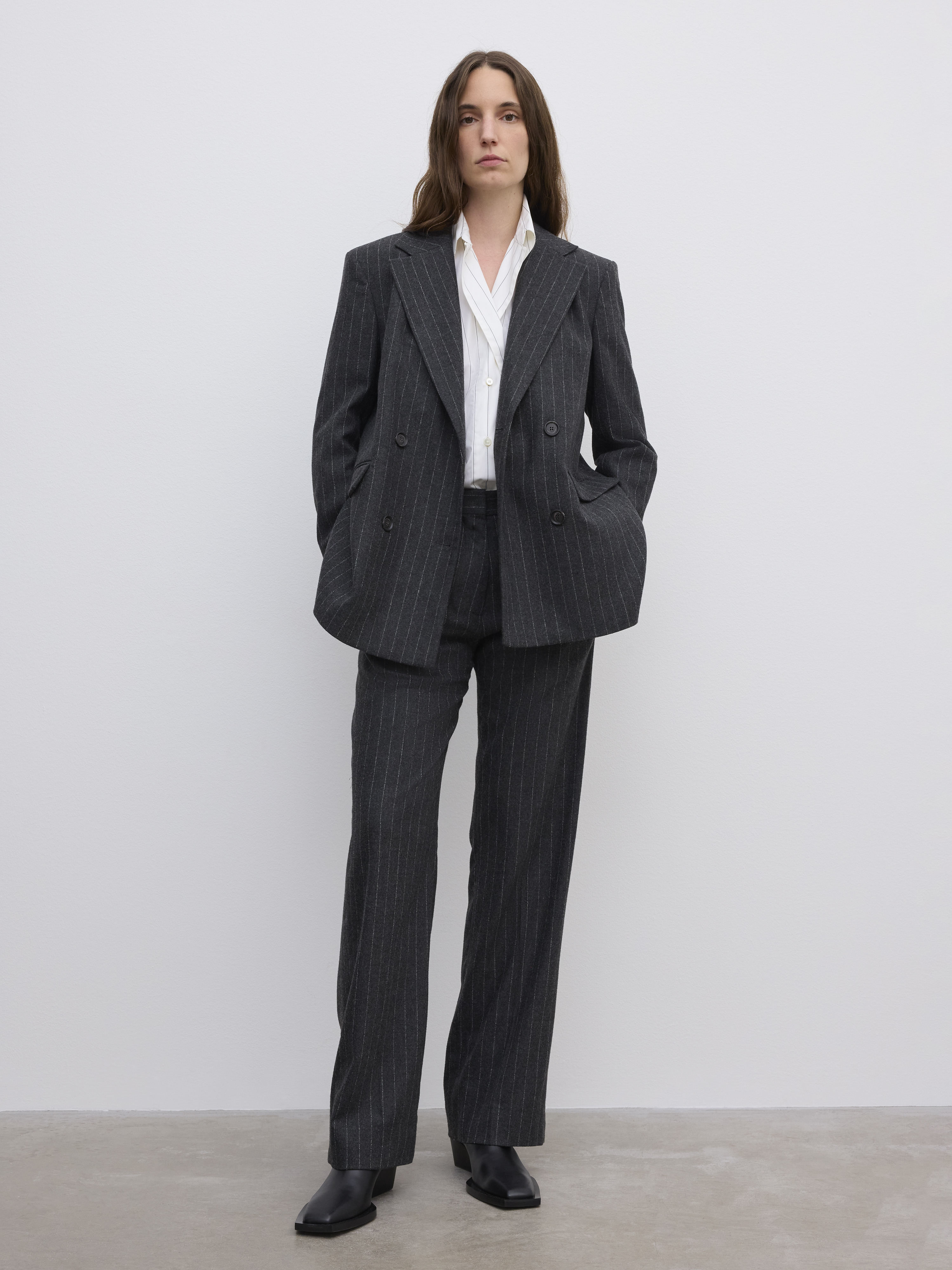 Tailored double-breasted blazer in Italian flannel wool suiting. A wardrobe icon, complete with a pinstripe pattern, notched lapels, flap pockets, and back vents. Fully lined. FIT & SIZING Model is 177 cm / 5'8" and is wearing a size 36, UK 8, US 4. MATERIAL 43% Wool 24% Polyester 19% Polyamide 11% Viscose 2% Other f1% Elastane GARMENT CARE Dry clean GARMENT ORIGIN Produced in Portugal