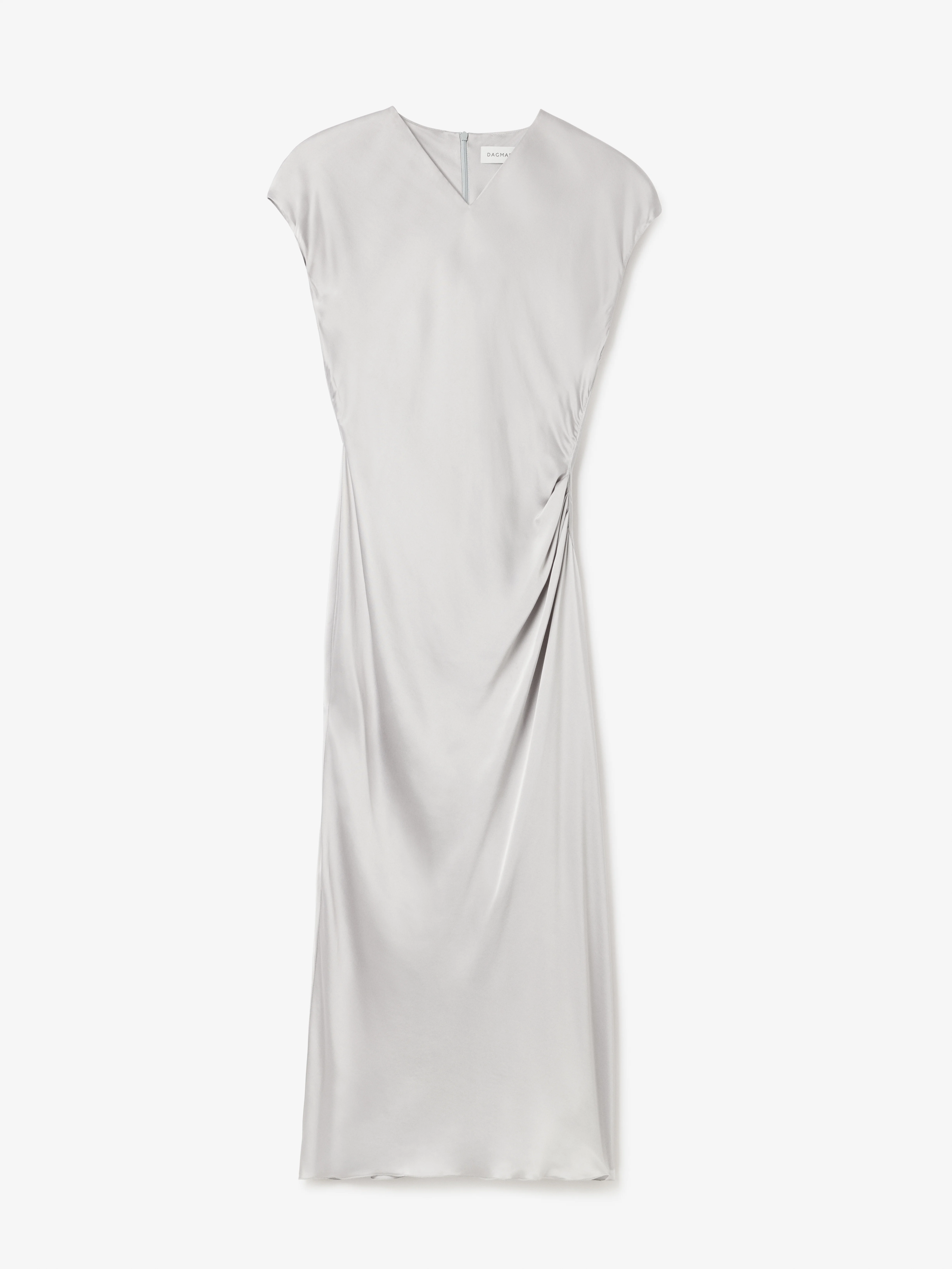 Mid-length dress in a fluid viscose satin accentuated by a v-neckline, cap sleeves and four knife pleats at the hip, creating a sinuous drape. Completed with a concealed zipper at the back. MATERIAL 100% Eco-friendly viscose GARMENT CARE Dry clean GARMENT ORIGIN Produced in Portugal