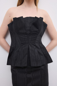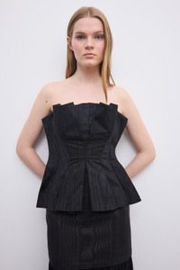Sleeveless top in Italian jacquard moire with a slim fit defined by sculptural pleats and a softly contrasted bodice, creating a dynamic interplay of texture and form. Features a concealed zip at the back. FIT & SIZING Model is 179 cm / 5'10.5" and is wearing a size 36, UK 8, US 4 MATERIAL 60% Cotton 40% Acetate GARMENT CARE Dry clean only GARMENT ORIGIN Produced in Portugal