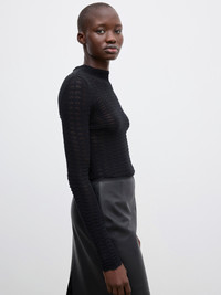 A fine-knit top in featherlight silk blend featuring a close fit, crew neck, and extended sleeves. Lace pattern by Dagmar’s in-house knitting atelier. FIT & SIZING Model is 176 cm / 5'7" and is wearing a size 36, UK 8, US 4. MATERIAL 70% Organic cotton, 20% Recycled nylon, 10% Silk GARMENT CARE Manually handwash cold, dry flat GARMENT ORIGIN Produced in Hong Kong SAR China