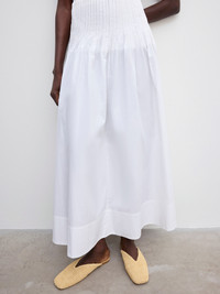 Full-length skirt in crisp and light organic cotton poplin pairing a fitted pintuck waist with a breezy A-line frame. Finished with a structured hem, in-seam zipper and a button-and-loop closure at the back. FIT & SIZING Model is 178cm/ 5'8" and is wearing a size 36, UK 8, US 4. MATERIAL 100% Organic cotton GARMENT CARE Machine wash, 30° delicate GARMENT ORIGIN Produced in Portugal