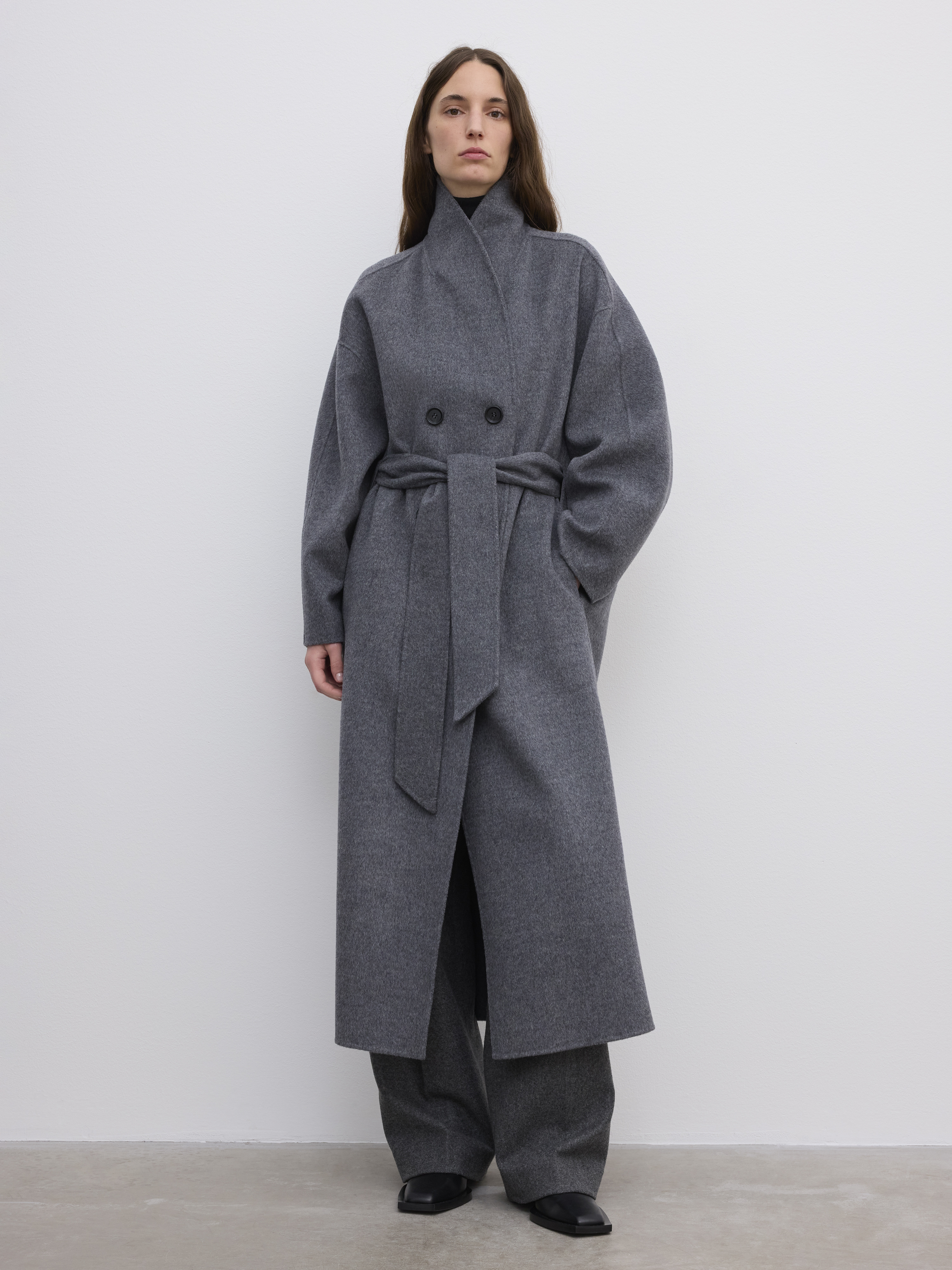 Double-breasted full-length coat made from luxurious wool double, presented with a soft cocoon silhouette, dropped shoulders, rounded sleeves, and a shawl collar. Finished with in-seam pockets, a removable belt and handstitched detailing. FIT & SIZING Model is 177 cm / 5'8" and is wearing a size 36, UK 8, US 4. MATERIAL 100% Wool GARMENT CARE Dry clean GARMENT ORIGIN Produced in China
