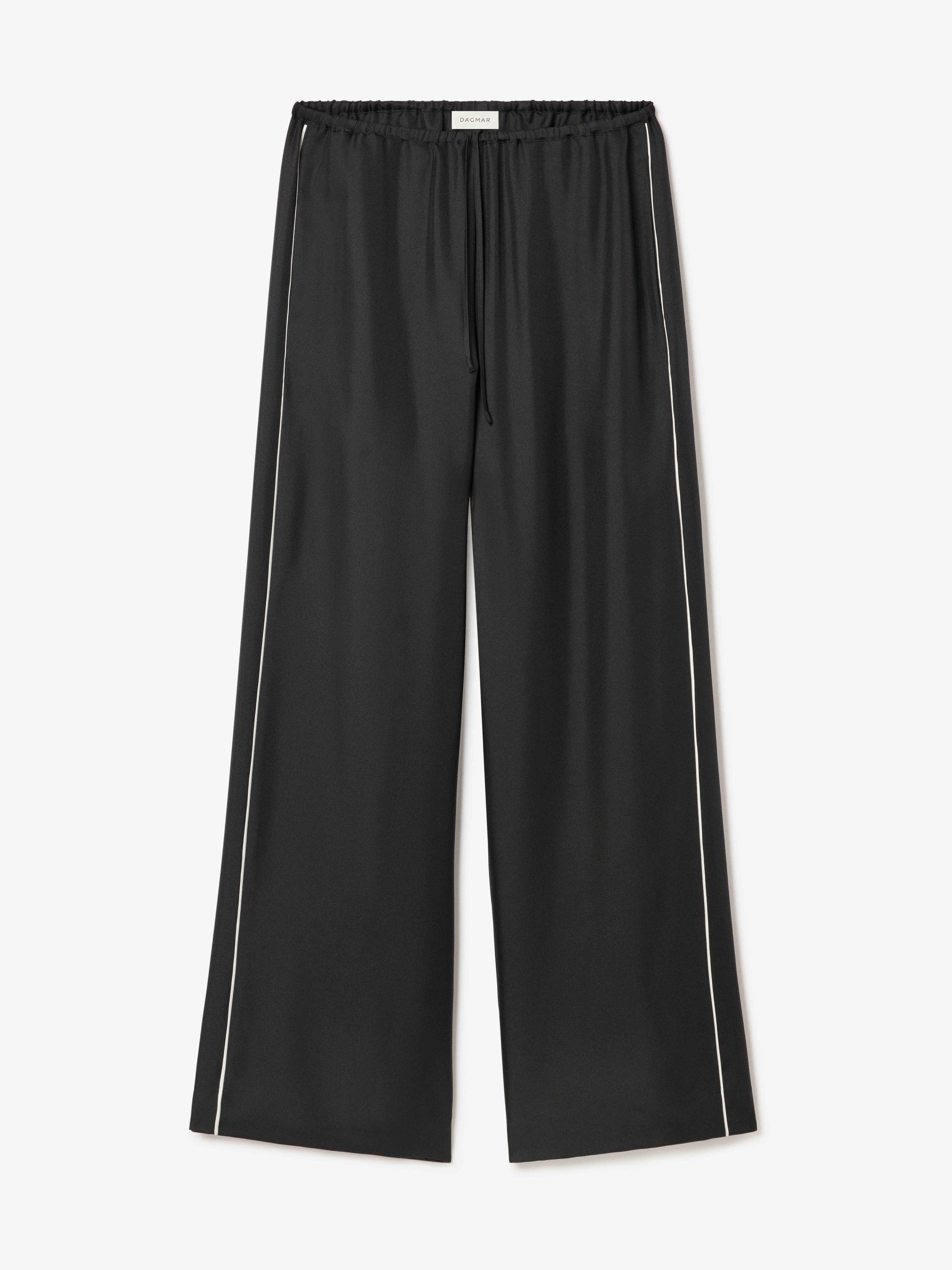 Relaxed trousers in fluid silk with a narrow elasticated drawstring waist, straight wide legs, and discreet in-seam pockets. Contrasting piping along the sides adds a refined finish. MATERIAL 100% Silk GARMENT CARE Dry clean only GARMENT ORIGIN Produced in China