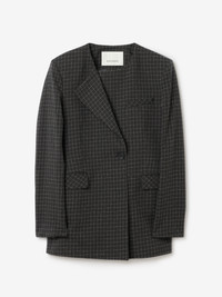 Blazer in seasonal check designed with a sharp shoulder and an hourglass silhouette, featuring an asymmetrical front closure that can also be worn straight. Detailed with flap pockets, vents at the back and sleeves, and finished with signature Dagmar-branded buttons for a refined touch. FIT & SIZING Model is 179 cm / 5'10.5" and is wearing a size 36, UK 8, US 4 MATERIAL 72% Cotton 27% Linen 1% Polyamide GARMENT ORIGIN Produced in Portugal