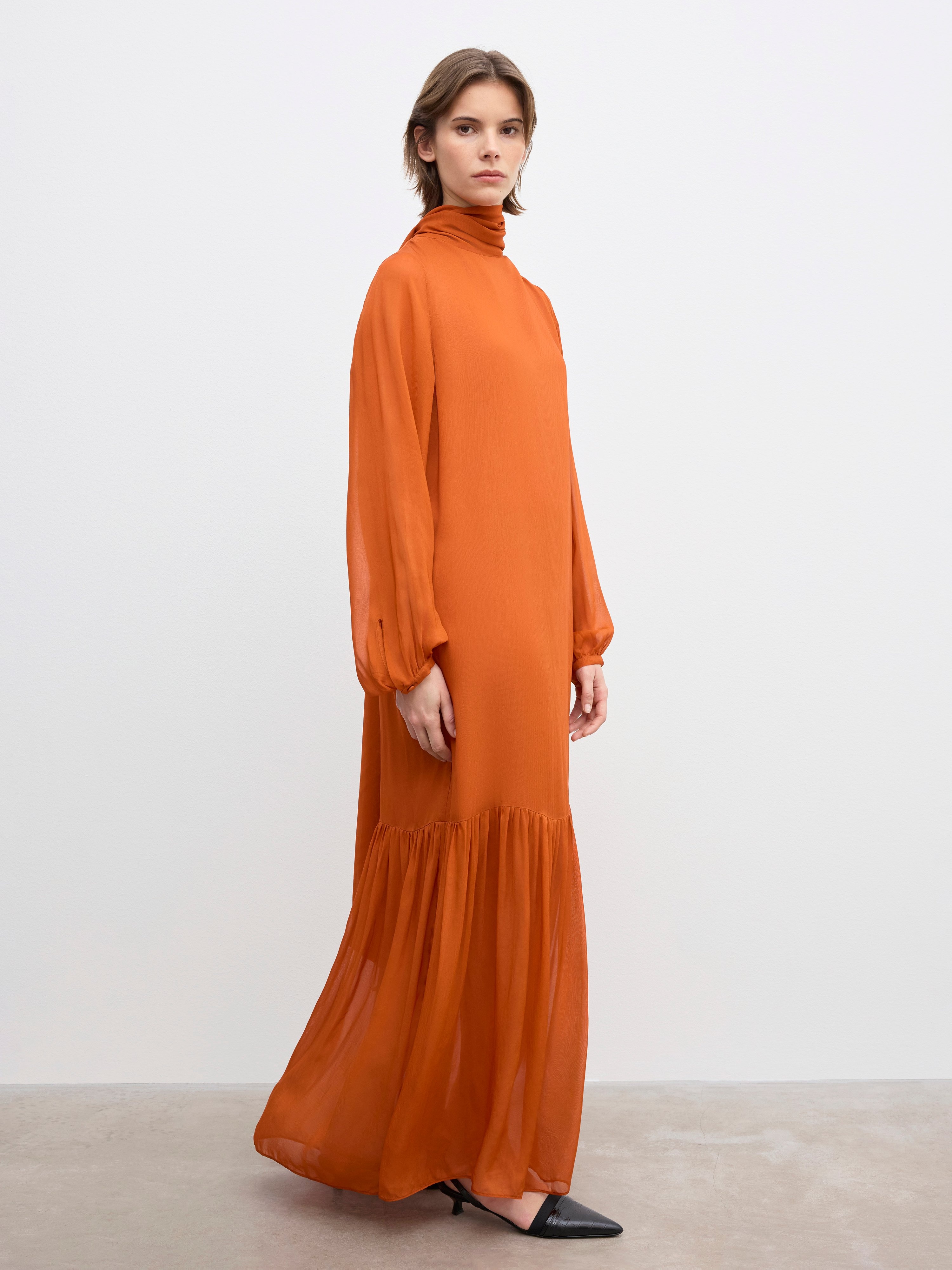 Sheer ankle-length dress in lightweight viscose featuring a fluid frame, panelled skirt, and scarf detailing at the collar. Lined body. FIT & SIZING Model is 176 cm / 5'7" and is wearing a size 36, UK 8, US 4. MATERIAL 100% Viscose GARMENT CARE Dry clean GARMENT ORIGIN Produced in Portugal