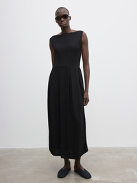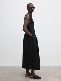Sleeveless ankle-length dress with a soft hand feel, framed by a close-fitting top, a gently draped, high, and wide feminine neckline, and a pleated skirt. Features in-seam pockets. FIT & SIZING Model is 178cm/ 5'8" and is wearing a size 36, UK 8, US 4. MATERIAL 100% Tencel GARMENT CARE Machine wash, 30° delicate GARMENT ORIGIN Produced in Portugal