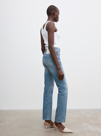 Responsibly made from our exceptional organic cotton, these jeans are cut to a 5-pocket silhouette. Shaped to a straight mid-rise fit, they offer a modern take on a classic style. This style runs small, we recommend sizing up one size - Organic cotton - 5 pocket denim construction - Button fly - Mid-rise - Straight leg - Made in Italy - Model is 178cm/ 5'8" and is wearing a size 27/34 - This style runs small, we recommend sizing up one size FIT & SIZING Model is 178cm/ 5'8" and is wearing a size 27/34. Mid rise Button fly Fitted leg Classic denim fabric, no added stretch material MATERIAL 100% Organic Cotton. GARMENT ORIGIN Produced in Italy