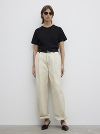 Mid-rise chino-style trousers in contrasting cotton, reprised in the buttons, waistband, and seams. Offered with a relaxed straight leg, in-seam pockets, and a rear welt pocket. FIT & SIZING Model is 176 cm / 5'7" and is wearing a size 36, UK 8, US 4. MATERIAL 98% Cotton, 2% Polyamide GARMENT CARE Dry clean GARMENT ORIGIN Produced in Portugal