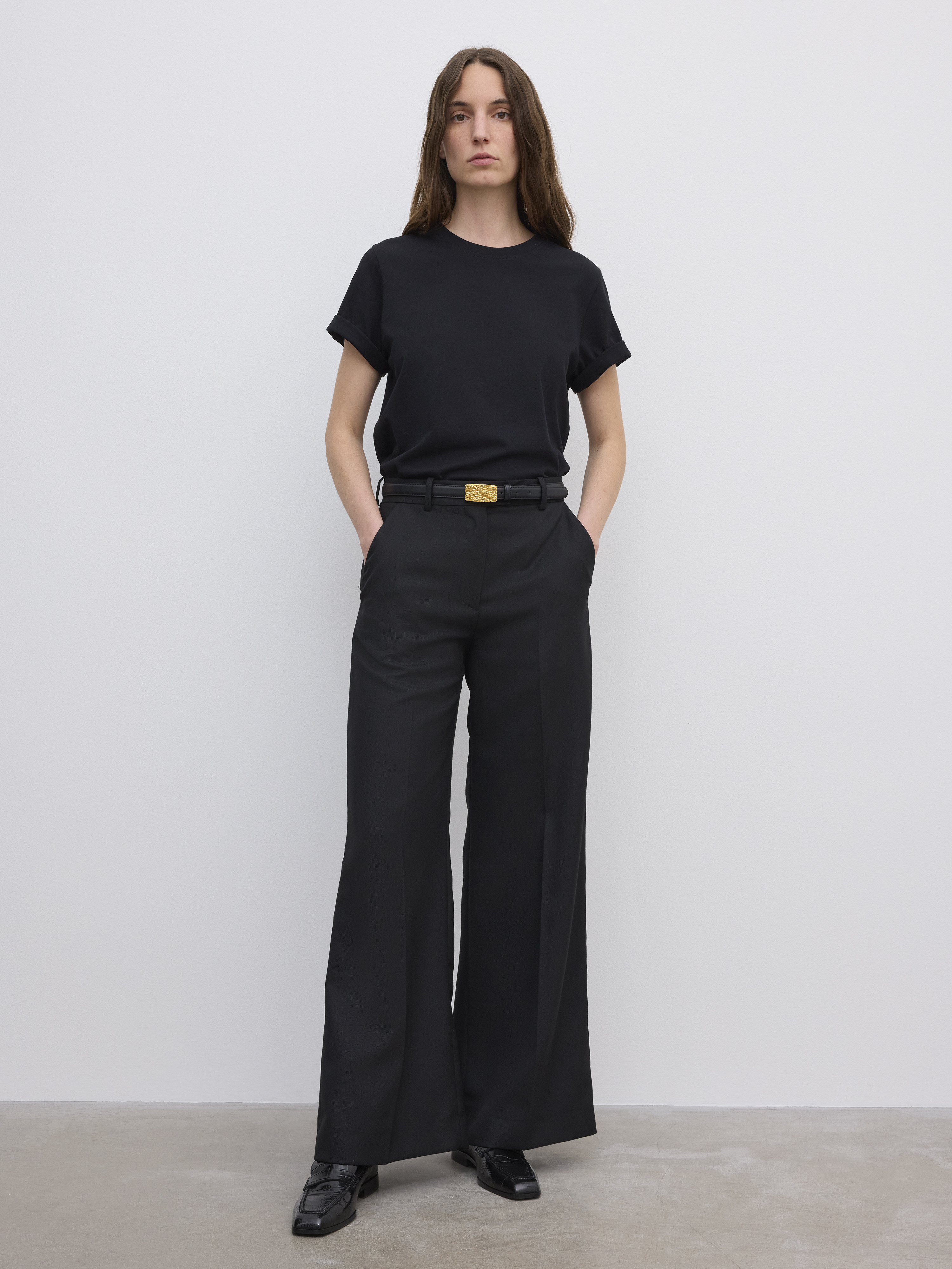 Mid-rise trousers featuring a wide leg frame, tailored waistband and pressed creases. FIT & SIZING Model is 177cm/ 5'8" and is wearing a size 36, UK 8, US 4. MATERIAL 55% Polyester, 45% Wool GARMENT CARE Machine wash 30 GARMENT ORIGIN Produced in Portugal