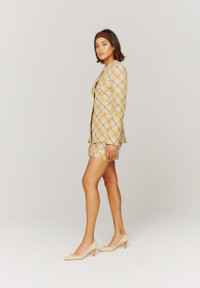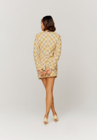 Designed for a standard fit, we recommend selecting your normal size Robyn is 5'9 and wears a UK 8 Our take on our heritage tartan Mini a-line silhouette 2-tone yellow colour way Darts on the waistband Side zip closure Metal bar with branding Paired with the matching 'Check Collarless Blazer' FABRIC COMP SHELL: 60% POLYESTER, 40% COTTON LINING: 100% COTTON