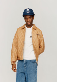 Designed for a standard fit, we recommend selecting your normal size Daniel is 6'0 and wears a size Large Boxy, oversized fit Quilted vegan leather Corduroy collar Varsity style bomber Double zip closure HoS embroidery on the chest 2 front kangaroo pockets Ribbed cuff and hem Featuring back vents for movement FABRIC COMP SHELL: 100% POLYURETHANE LINING: 80% POLYESTER, 20% COTTON RIBBING: 98% POLYESTER, 2% ELASTANE