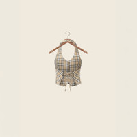 Designed for a standard fit, we recommend selecting your normal size Lee is 5'8, is a size UK 10 and wears a UK 10 Waistcoat design Thick structured canvas material Adjustable ties in the back Adjustable halter neck, with button closure Custom checkered print all-over Button down Complete the set with the 'SLOANE CHECK SHORT' FABRIC COMP 87% POLYESTER, 10% VISCOSE, 3% ELASTANE COLOUR MULTI