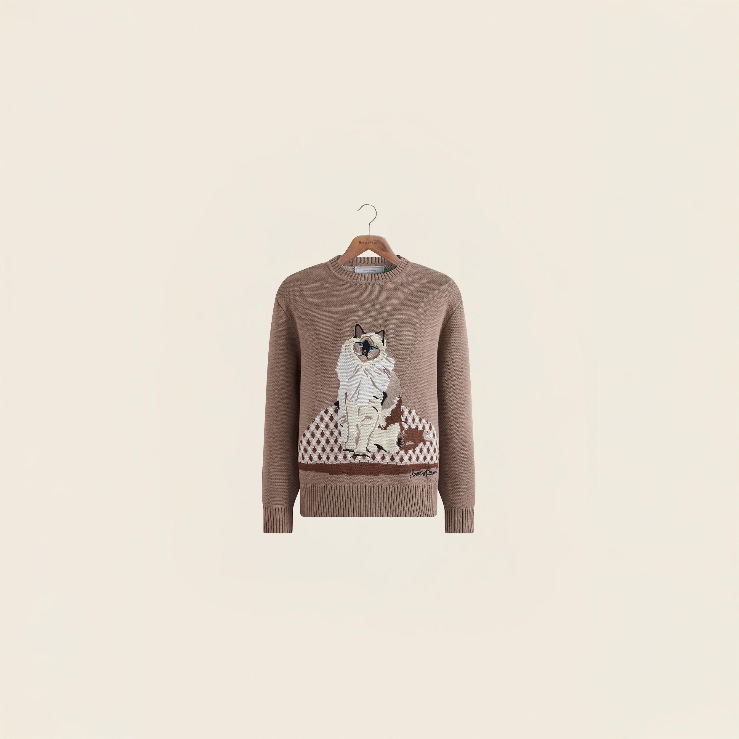 This product is unisex and comes up oversized, we recommend sizing down. Classic House of Sunny silhouette Ragdoll cat design Ribbed knit hem Custom HOS colour palette Embroidered top note details Rolled trim Vegan knit Updated with cotton for breathability FABRIC COMP 52% COTTON, 48% ACRYLIC COLOUR KIBBLE