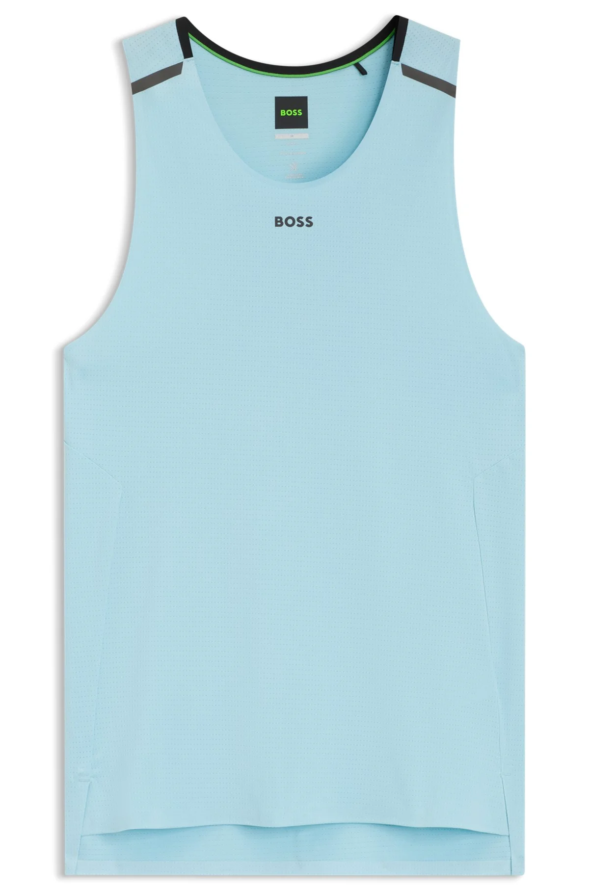 SIZE AND FIT The model wears a size M and is 6'2" tall with a, 36" chest, 31" waist and 38" hips. DETAILS Tank Active Seas - 50542965 Offering moisture management, this quick-dry BOSS Menswear tank top is cut to a clean fit. Stretch mesh with decorative reflective details. Lightweight and breathable. Slim fit Neckline: Crew neck Short sleeves Side slit Standard length QUALITY & CARE INSTRUCTIONS Do Not Bleach Quality: 86% Polyester, 14% Elastane Do Not Tumble Dry Iron Low Heat Do Not Dry Clean Machine Wash Cold Gentle