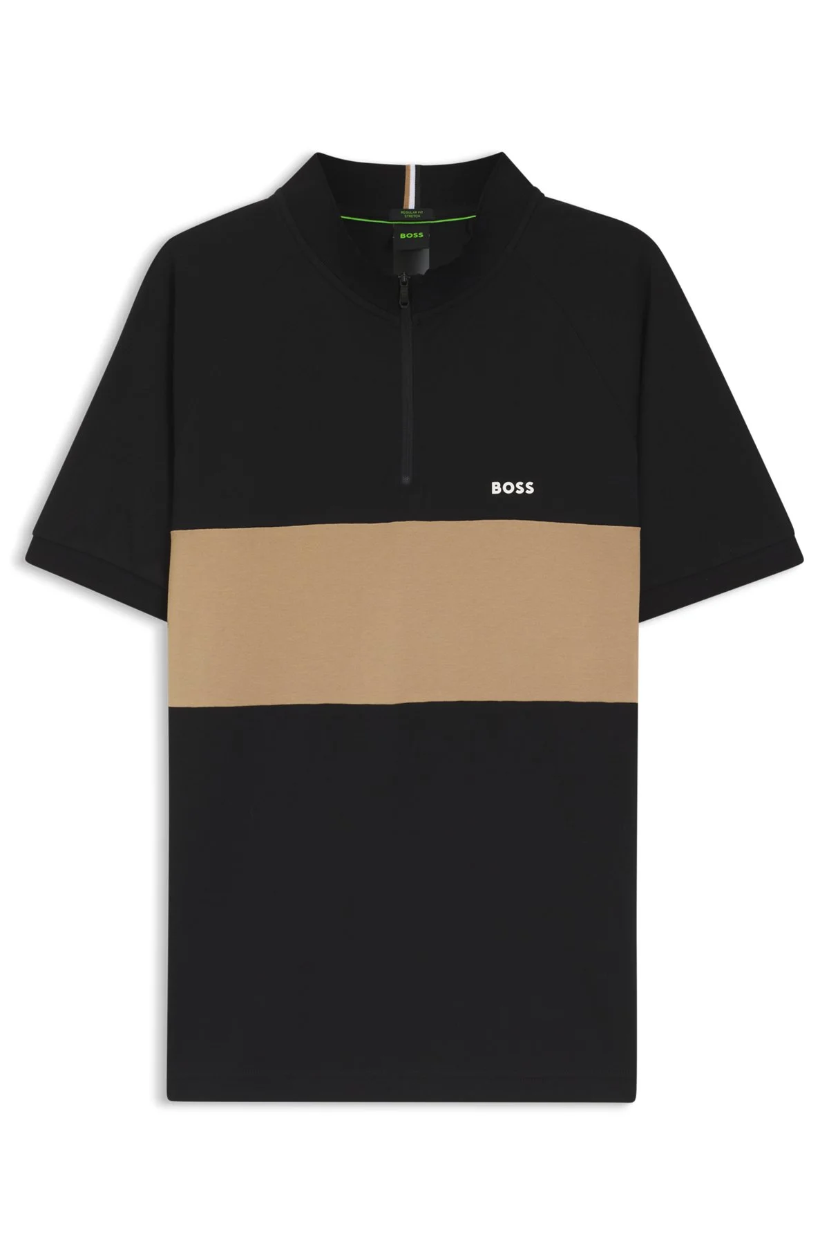 SIZE AND FIT The model wears a size M and is 6'2" tall with a, 36" chest, 31" waist and 38" hips. DETAILS Pollan ASP - 50538102 With UV protection and moisture management, this BOSS Menswear polo shirt has a mock collar with a zip. Quick-dry stretch material. Regular fit Neckline: Stand collar Fastening top: Zip closure Short sleeves Flat-knit cuffs Standard length QUALITY & CARE INSTRUCTIONS Machine Wash Cold Gentle Iron Low Heat Do Not Bleach Quality: 56% Cotton, 39% Polyester, 5% Elastane Do Not Dry Clean Do Not Tumble Dry